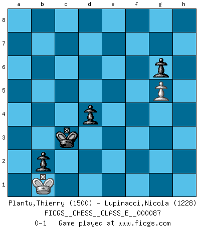 Last move : 0-1 2008 July 27 21:37:57 [Event "FICGS__CHESS__CLASS_E__000087"] [Site "FICGS"] [Date "2008.07.26"] [Round "1"] [White "Plantu,Thierry"] [Black "Lupinacci,Nicola"] [Result "0-1"] [WhiteElo "1500"] [BlackElo "1228"] 1.c4 Nf6 2.d4 g6 3.Nc3 d5 4.cxd5 Nxd5 5.e4 Nxc3 6.bxc3 c5 7.dxc5 Bg7 8.Qxd8+ Kxd8 9.Bb2 Bd7 10.O-O-O Kc7 11.Nf3 Rd8 12.Bc4 e6 13.Rd3 Nc6 14.Rhd1 Ne5 15.Nxe5 Bxe5 16.Ba3 Bc6 17.Rxd8 Rxd8 18.Re1 Bxc3 19.Re2 Rd4 20.Bb3 Rxe4 21.Rxe4 Bxe4 22.f3 Bd5 23.Kc2 Be5 24.Bxd5 exd5 25.h3 Kc6 26.Kb3 Bd4 27.Kc2 Bxc5 28.Bxc5 Kxc5 29.g4 b5 30.h4 a5 31.f4 Kc4 32.f5 d4 33.fxg6 fxg6 34.h5 b4 35.hxg6 hxg6 36.g5 a4 37.Kd2 b3 38.axb3+ axb3 39.Kc1 Kc3 40.Kb1 b2 0-1 English, 1...Nf6 (Anglo-Indian defense) Queenside Castling by player White (move 10) 10 pieces endgame at move 33 : White KPPP , Black KPPPPP WHITE : King + 3 Pawns BLACK : King + 5 Pawns 9 pieces endgame at move 35 : White KPPP , Black KPPPP WHITE : King + 3 Pawns BLACK : King + 4 Pawns 8 pieces endgame at move 35 : White KPP , Black KPPPP WHITE : King + 2 Pawns BLACK : King + 4 Pawns 7 pieces endgame at move 38 : White KPP , Black KPPP WHITE : King + 2 Pawns BLACK : King + 3 Pawns 6 pieces endgame at move 38 : White KP , Black KPPP WHITE : King + 1 Pawn BLACK : King + 3 Pawns Player Black won this chess game. Follow this game move after move (download)In Chess, just as in life, today's bliss may be tomorrow's poison. (Assaic) Ich las kürzlich ein Buch von Nietzsche. Er sagte Religion verdumme nur die Menschen. Ich stimme zu. (Robert James Fischer) El Ajedrez es una hermosa aventura. (Bent Larsen) Lorsque vous vous retrouvez devant une position atroce, ne tendez pas un ultime piège dérisoire avec l'intention d'abandonner si l'adversaire le déjoue ! Faites-vous plutôt un devoir de résister comme si votre vie en dépendait. Jouez le coup qui vous déplairait au centuple si vous étiez dans la peau de votre tortionnaire ! Go and wake up your luck. (Persian saying)