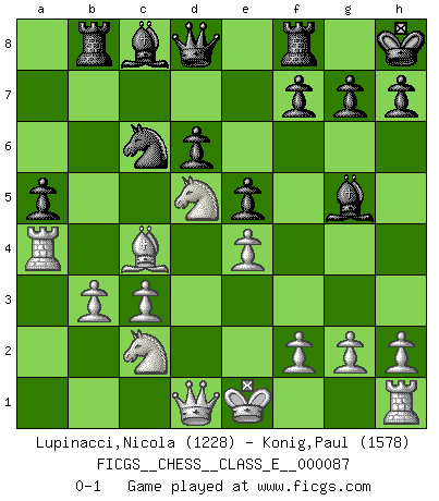 Last move : 0-1 2008 October 22 0:30:8 [Event "FICGS__CHESS__CLASS_E__000087"] [Site "FICGS"] [Date "2008.07.26"] [Round "1"] [White "Lupinacci,Nicola"] [Black "Konig,Paul"] [Result "0-1"] [WhiteElo "1228"] [BlackElo "1578"] 1.e4 c5 2.Nf3 Nc6 3.d4 cxd4 4.Nxd4 Nf6 5.Nc3 e5 6.Ndb5 d6 7.Bg5 a6 8.Na3 b5 9.Nd5 Be7 10.Bxf6 Bxf6 11.c3 Bg5 12.Nc2 O-O 13.a4 bxa4 14.Rxa4 a5 15.Bc4 Rb8 16.b3 Kh8 0-1 Sicilian : Pelikan (Lasker/Sveshnikov) variation Kingside Castling by player Black (move 12) Player Black won this chess game. Follow this game move after move (download)Chess is really ninety nine percent calculation. (Soltis) Jeder Schachmeister war einmal ein Anfänger. (Irving Chernev) Vive, pierde y aprende al observar a tu oponente como gana. (Amber Steenbock) Le système Elo représente seulement une moyenne. Il est simplement un indicateur de votre stabilité. (Anatoli Karpov) Do you know these so called Volunteers don't even get paid! (Simpsons)