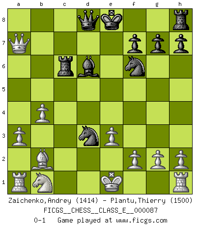 Last move : 0-1 2008 August 15 17:30:34 [Event "FICGS__CHESS__CLASS_E__000087"] [Site "FICGS"] [Date "2008.07.26"] [Round "1"] [White "Zaichenko,Andrey"] [Black "Plantu,Thierry"] [Result "0-1"] [WhiteElo "1414"] [BlackElo "1500"] 1.b4 e5 2.Bb2 e4 3.e3 Nf6 4.a3 d5 5.c4 Be6 6.cxd5 Bxd5 7.d3 Nbd7 8.dxe4 Bxe4 9.Nf3 Bd6 10.Bc4 Bxf3 11.Qxf3 Ne5 12.Qxb7 Rb8 13.Qa6 Rb6 14.Bb5+ c6 15.Bxc6+ Rxc6 16.Qxa7 Nd3+ 0-1 Polish (Sokolsky) opening Player Black won this chess game. Follow this game move after move (download)In Fischer's hands, a slight theoretical advantage is as good a being a Queen ahead. (Isaac Kashdan) Schach ist gnadenlos. Du mußt bereit sein zu töten. (Nigel Short) La captura del Rey enemigo es la finalidad pero no el primer objetivo de la partida. (William Steinitz) Il vaut toujours mieux jouer un plan faux de façon logique que de n'avoir pas de plan du tout. (Victor Kortchnoï) An expert is a man who has made all the mistakes which can be made in a very narrow field. (Niels Bohr)