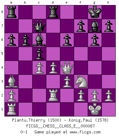 Last move : 0-1 2008 December 1 10:36:47 [Event "FICGS__CHESS__CLASS_E__000087"] [Site "FICGS"] [Date "2008.07.26"] [Round "1"] [White "Plantu,Thierry"] [Black "Konig,Paul"] [Result "0-1"] [WhiteElo "1500"] [BlackElo "1578"] 1.c4 Nf6 2.d4 g6 3.Nf3 Bg7 4.Nc3 d5 5.e3 e6 6.cxd5 Nxd5 7.Bc4 Nxc3 8.bxc3 O-O 9.O-O c5 10.Ba3 b6 11.Qc2 Nd7 12.Rfd1 Qc7 13.Bb5 a6 14.Bxd7 Bxd7 15.Qd3 Bb5 16.c4 Ba4 17.Rd2 Rfd8 18.Qe4 Bc6 0-1 English, 1...Nf6 (Anglo-Indian defense) Kingside Castling by player Black (move 8) Kingside Castling by player White (move 9) Player Black won this chess game. Follow this game move after move (download)If your opponent offers you a draw, try to work out why he thinks he's worse off. (Nigel Short) Das Zentrum ist der Balkan des Schachbretts - Kriegshandlungen können in jedem Moment ausbrechen. (Aaron Nimzowitsch) Aún el Rey más flojo huye despavorido ante la amenaza de un Jaque doble. (Aaron Nimzowitsch) Nous sommes les pions de la mystérieuse partie d'Echecs jouée par Dieu. Il nous déplace, nous arrête, nous pousse encore, puis nous lance un à un dans la boîte du Néant. Epitaphe sur la tombe de David Janowsky (1868-1927). Treat your password like your toothbrush. Don't let anybody else use it, and get a new one every six months. (Clifford Stoll)