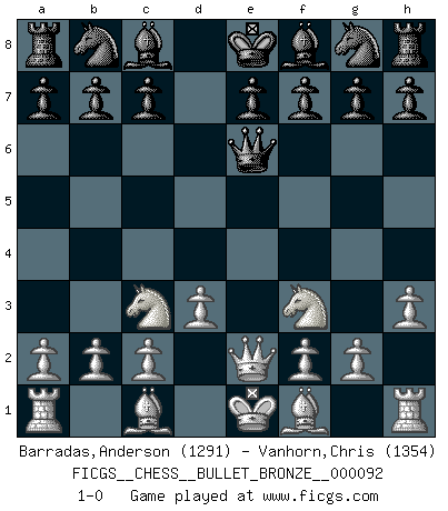 Last move : 1-0 2009 March 18 23:14:58 [Event "FICGS__CHESS__BULLET_BRONZE__000092"] [Site "FICGS"] [Date "2009.03.18"] [Round "1"] [White "Barradas,Anderson"] [Black "Vanhorn,Chris"] [Result "1-0"] [WhiteElo "1291"] [BlackElo "1354"] 1.e4 d5 2.exd5 Qxd5 3.Nc3 Qe5+ 4.Qe2 Qg5 5.Nf3 Qf5 6.d3 Qe6 7.h3 1-0 This chess game has been lost on time (started : 2009.03.18 19:18:30) Scandinavian (centre counter) defense Player White won this chess game. Follow this game move after move (download)Chess is thirty to forty percent psychology. You don't have this when you play a computer. I can't confuse it. (Judith Polgar) Wer mein Gambit spielt, muß bereit sein, alle Brücken hinter sich abzubrechen. Es verändert den ganzen Menschen. Es wirkt wie ein Zauberstab und fördert verkümmerte, gute Charakter- eigenschaften wieder zu Tage. (Emil Joseph Diemer) A la fecha, Fischer esta simplemente un nivel arriba de todos los mejores jugadores de Ajedrez del mundo. (John Jacobs) Je crois qu'il existe des manières très spécifiques de jouer efficacement contre une machine. Evidemment, nous n'avons aucune chance en technique pure, parce que l'ordinateur calcule de manière parfaite. Mais lorsque nous faisons appel à notre cerveau, en utilisant l'intuition et la compréhension, alors nous restons beaucoup plus forts. (Anatoli Karpov) Inventor: A person who makes an ingenious arrangement of wheels, levers and springs, and believes it civilization. (Ambrose Bierce, The Devil's Dictionary)