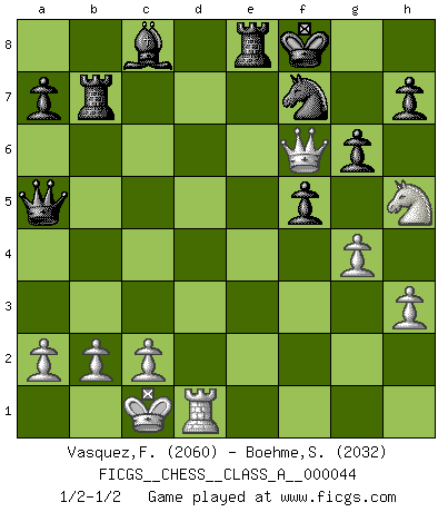 Last move : 1/2-1/2 2008 October 22 3:24:5 [Event "FICGS__CHESS__CLASS_A__000044"] [Site "FICGS"] [Date "2008.07.28"] [Round "1"] [White "Vasquez,Fernando"] [Black "Boehme,Sebastian"] [Result "1/2-1/2"] [WhiteElo "2060"] [BlackElo "2032"] 1.e4 g6 2.Nc3 c5 3.Nf3 Bg7 4.d4 cxd4 5.Nxd4 Nc6 6.Be3 Nf6 7.Nxc6 bxc6 8.e5 Ng8 9.f4 Nh6 10.Qd2 O-O 11.h3 Qa5 12.O-O-O Rb8 13.Bc4 d5 14.Bb3 f6 15.exf6 Bxf6 16.g4 Nf7 17.Rhe1 Rb7 18.Bd4 Bxd4 19.Qxd4 e6 20.f5 exf5 21.Bxd5 cxd5 22.Nxd5 Rd8 23.Re8+ Rxe8 24.Nf6+ Kg7 25.Nh5+ Kf8 26.Qg7+ Ke7 27.Qf6+ Kf8 1/2-1/2 Robatsch (Modern) defense Kingside Castling by player Black (move 10) Queenside Castling by player White (move 12) This chess game ended in a draw. Follow this game move after move (download)The defensive power of a pinned piece is only imaginary. (Aaron Nimzovich) Garry Kasparov war erst in der Großmeister-Organisation GMA, dann in der Profischach-Vereinigung PCA, zum Schluss kehrte er wieder in den Schoß der FIDE zurück. Aber gut, manche Leute sind flexibel (Viswanathan Anand) Muchos jugadores de Ajedrez se sorprendían cuando después de la partida, Fischer explicaba con calma: 'Yo ya había analizado esta posibilidad' en una posición en la cual yo creía que no era posible de prever desde la apertura. (Mikhail Tal) Ce n'est pas pour s'amuser qu'il joue aux échecs : il célèbre un culte. (Vladimir Nabokov) Your best chance to get a Royal Flush in a casino is in the bathroom. (Anonymous)