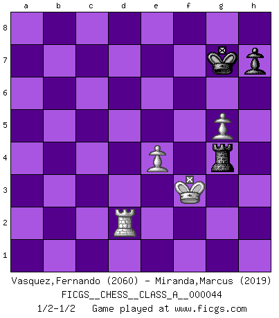 Last move : 1/2-1/2 2009 January 10 16:11:59 [Event "FICGS__CHESS__CLASS_A__000044"] [Site "FICGS"] [Date "2008.07.28"] [Round "1"] [White "Vasquez,Fernando"] [Black "Miranda,Marcus"] [Result "1/2-1/2"] [WhiteElo "2060"] [BlackElo "2019"] 1.e4 c5 2.d4 cxd4 3.c3 Nf6 4.e5 Nd5 5.Nf3 Nc6 6.cxd4 d6 7.Bc4 Nb6 8.Bb5 dxe5 9.Nxe5 Bd7 10.Nxd7 Qxd7 11.Nc3 e6 12.O-O Be7 13.Qg4 O-O 14.Bxc6 bxc6 15.Bh6 Bf6 16.Rfd1 Rfd8 17.Ne4 Qe7 18.Rac1 Rac8 19.h4 Rd5 20.Bg5 Nd7 21.Rc4 Bxg5 22.hxg5 Qd8 23.Rdc1 Nf8 24.g3 Ng6 25.Kg2 Ra5 26.Rxc6 Rxc6 27.Rxc6 Rxa2 28.Rc5 Rxb2 29.d5 Ne5 30.Qd1 Qa8 31.Qd4 Nd7 32.Rc4 Rb7 33.Nd6 Rb8 34.Rc7 Nb6 35.Rxf7 Qxd5+ 36.Qxd5 exd5 37.Rxa7 d4 38.Nf5 d3 39.Rxg7+ Kh8 40.Ra7 d2 41.Ra1 Nc4 42.Ne3 Nxe3+ 43.fxe3 Rg8 44.Rd1 Rd8 45.Kf2 Rd5 46.e4 Rd3 47.g4 Kg7 48.Ke2 Rg3 49.Rxd2 Rxg4 50.Kf3 1/2-1/2 Sicilian : Smith-Morra gambit Kingside Castling by player White (move 12) Kingside Castling by player Black (move 13) 10 pieces endgame at move 42 : White KRPPP , Black KRNPP WHITE : King + 1 Rook 3 Pawns BLACK : King + 1 Rook 1 Knight 2 Pawns 9 pieces endgame at move 43 : White KRPPP , Black KRPP WHITE : King + 1 Rook 3 Pawns BLACK : King + 1 Rook 2 Pawns 8 pieces endgame at move 49 : White KRPPP , Black KRP WHITE : King + 1 Rook 3 Pawns BLACK : King + 1 Rook 1 Pawn 7 pieces endgame at move 49 : White KRPP , Black KRP WHITE : King + 1 Rook 2 Pawns BLACK : King + 1 Rook 1 Pawn This chess game ended in a draw. Follow this game move after move (download)Chess is a part of culture and if a culture is declining then Chess too will decline. (Mikhail Botvinnik) Ich würde mich als ganz normalen Jungen bezeichnen [Im Alter von 12]. (Sergej Karjakin) Cuando tengas duda... ¡juega al Ajedrez!. (Tevis) J'apprécie les joueurs d'est-indienne, c'est grâce à eux que je nourris ma famille depuis tant d'années. (Petrosian) A belief is an idea the mind possesses, an idea that possesses the mind. (Robert Oxden Bolton)