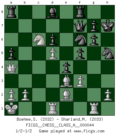 Last move : 1/2-1/2 2009 March 11 1:25:39 [Event "FICGS__CHESS__CLASS_A__000044"] [Site "FICGS"] [Date "2008.07.28"] [Round "1"] [White "Boehme,Sebastian"] [Black "Sharland,Michael"] [Result "1/2-1/2"] [WhiteElo "2032"] [BlackElo "2033"] 1.e4 c5 2.Nf3 d6 3.d4 cxd4 4.Nxd4 Nf6 5.Nc3 a6 6.f3 e5 7.Nb3 Be7 8.Be3 O-O 9.Qd2 Be6 10.O-O-O Nbd7 11.g4 b5 12.g5 Nh5 13.Nd5 Bxd5 14.exd5 f6 15.g6 hxg6 16.Na5 Qe8 17.Qb4 f5 18.Nc6 Ndf6 19.c4 e4 20.Be2 bxc4 21.Qxc4 Bd8 22.Rhe1 Kh8 23.Kb1 a5 24.Qa4 Qf7 25.Rg1 Kh7 26.Ka1 Rc8 27.Ba6 Ra8 28.Be2 1/2-1/2 Sicilian : Najdorf Kingside Castling by player Black (move 8) Queenside Castling by player White (move 10) This chess game ended in a draw. Follow this game move after move (download)The King is a fighting piece. Use it ! (Wilhelm Steinitz) Die größte Kunst beim Schach besteht darin dem Gegner nicht zu zeigen was er tun kann. (Garry Kasparov) El Ajedrez es 99 por ciento táctica. (Teichmann) Tout change constamment, y compris dans le monde des Echecs. (Botvinnik) The general who wins the battle makes many calculations in his temple before the battle is fought. The general who loses makes but few calculations beforehand. (Sun Tzu)