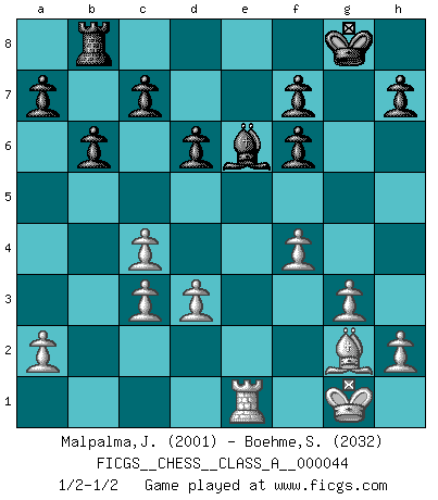 Last move : 1/2-1/2 2008 October 17 15:21:21 [Event "FICGS__CHESS__CLASS_A__000044"] [Site "FICGS"] [Date "2008.07.28"] [Round "1"] [White "Malpalma,Joaquim"] [Black "Boehme,Sebastian"] [Result "1/2-1/2"] [WhiteElo "2001"] [BlackElo "2032"] 1.c4 e5 2.Nc3 Nf6 3.Nf3 Nc6 4.g3 Bb4 5.Bg2 O-O 6.O-O e4 7.Ng5 Bxc3 8.bxc3 Re8 9.Qc2 Qe7 10.d3 exd3 11.exd3 d6 12.Nf3 Ne5 13.Nxe5 Qxe5 14.Rb1 Rb8 15.Be3 b6 16.Bd4 Qe2 17.Qxe2 Rxe2 18.Rfe1 Rxe1+ 19.Rxe1 Be6 20.Bxf6 gxf6 21.f4 1/2-1/2 English Opening Kingside Castling by player Black (move 5) Kingside Castling by player White (move 6) This chess game ended in a draw. Follow this game move after move (download)The enormous mental resilience, without which no Chess player can exist, was so much taken up by Chess that he could never free his mind of this game. (Albert Einstein) Kostenjuk hat keinen Sexappeal. (Loek van Wely) El Ajedrez es realmente noventa y nueve por ciento calculación. (Soltis) On peut tirer plus d'utilité d'une partie perdue que de 100 parties gagnées. (Capablanca) Establishing goals is all right if you don't let them deprive you of interesting detours. (Doug Larson)