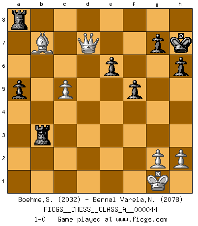 Last move : 1-0 2009 February 16 2:34:10 [Event "FICGS__CHESS__CLASS_A__000044"] [Site "FICGS"] [Date "2008.07.28"] [Round "1"] [White "Boehme,Sebastian"] [Black "Bernal Varela,Nelson"] [Result "1-0"] [WhiteElo "2032"] [BlackElo "2078"] 1.e4 c5 2.Nf3 d6 3.d4 cxd4 4.Nxd4 Nf6 5.Nc3 a6 6.Bg5 e6 7.f4 Qb6 8.Qd2 Qxb2 9.Rb1 Qa3 10.e5 dxe5 11.fxe5 Nfd7 12.Ne4 h6 13.Bh4 Qxa2 14.Rd1 Qd5 15.Qe3 Qxe5 16.Be2 Bc5 17.Bg3 Qd5 18.c4 Bxd4 19.Rxd4 Qa5+ 20.Rd2 O-O 21.Bd6 Rd8 22.O-O f5 23.Nc3 Nf6 24.Ra2 Qxa2 25.Nxa2 Rxd6 26.Qc5 Rc6 27.Qd4 Kh7 28.Nb4 Rc7 29.Qd8 Rc5 30.Qe7 Ra5 31.Qc7 Nc6 32.Nxc6 Rc5 33.Qe7 Rxc6 34.Rd1 Rb6 35.Bf3 Bd7 36.Rxd7 Nxd7 37.Qxd7 a5 38.c5 Rb3 39.Bxb7 1-0 Sicilian : Najdorf, 7...Qb6 Kingside Castling by player Black (move 20) Kingside Castling by player White (move 22) Player White won this chess game. Follow this game move after move (download)A man that will take back a move at Chess will pick a pocket. (Richard Fenton) Ein Springer auf f6 gegen die eigene Rochadestellung ist schlimmer als ein rostiger Nagel im Knie. (Efim Bogoljubov) Fischer sacrificó virtualmente todo lo que la mayoría de nosotros los 'debiles' (término que él usa) valoramos, respetamos y apreciamos por el amor de un astuto, a menudo hermoso tablero de juego, por el privilegio ambivalente de ser su mas grande maestro. (Paul Kollar) Il s'avisa de me proposer d'apprendre les échecs qu'il jouait un peu... me voilà forcené des échecs. J'achète un échiquier, je m'enferme dans ma chambre, j'y passe des jours et des nuits à vouloir apprendre par cur toutes les parties. (Jean-Jacques Rousseau, Confessions) May I never be complete. May I never be content. May I never be perfect. Deliver me, Tyler, from being perfect and complete. (Chuck Palahniuk, Fight Club)