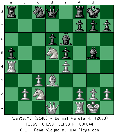 Last move : 0-1 2008 December 16 2:43:32 [Event "FICGS__CHESS__CLASS_A__000044"] [Site "FICGS"] [Date "2008.07.28"] [Round "1"] [White "Plante,Marc-Eric"] [Black "Bernal Varela,Nelson"] [Result "0-1"] [WhiteElo "2140"] [BlackElo "2078"] 1.e4 c5 2.Nf3 Nc6 3.d4 cxd4 4.Nxd4 Nf6 5.Nc3 e5 6.Ndb5 d6 7.Bg5 a6 8.Na3 b5 9.Nd5 Be7 10.Bxf6 Bxf6 11.c3 Bg5 12.Nc2 O-O 13.a4 bxa4 14.Rxa4 a5 15.Bb5 Na7 16.Bd3 Be6 17.O-O Nc8 0-1 This chess game has been lost on time (started : 2008.07.28 18:1:15) Sicilian : Pelikan (Lasker/Sveshnikov) variation Kingside Castling by player Black (move 12) Kingside Castling by player White (move 17) Player Black won this chess game. Follow this game move after move (download)Man is a frivolous, a specious creature, and like a Chess player, cares more for the process of attaining his goal than for the goal itself. (Dostoyevsky) Ich trinke, ich rauche, ich spiele, ich liebe Frauen aber Fernschach ist ein Laster, das ich nicht habe. (Mikhail Nekhemyevich Tal) Cuando tengas duda... ¡juega al Ajedrez!. (Tevis) Je crois qu'il existe des manières très spécifiques de jouer efficacement contre une machine. Evidemment, nous n'avons aucune chance en technique pure, parce que l'ordinateur calcule de manière parfaite. Mais lorsque nous faisons appel à notre cerveau, en utilisant l'intuition et la compréhension, alors nous restons beaucoup plus forts. (Anatoli Karpov) A clear conscience is usually the sign of a bad memory. (Unknown)
