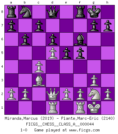 Last move : 1-0 2008 December 5 10:49:33 [Event "FICGS__CHESS__CLASS_A__000044"] [Site "FICGS"] [Date "2008.07.28"] [Round "1"] [White "Miranda,Marcus"] [Black "Plante,Marc-Eric"] [Result "1-0"] [WhiteElo "2019"] [BlackElo "2140"] 1.d4 Nf6 2.c4 e6 3.Nf3 b6 4.g3 Bb7 5.Bg2 Be7 6.O-O O-O 7.Nc3 Ne4 8.Bd2 f5 9.Qc2 Bf6 10.Rad1 Nxc3 11.Bxc3 Be4 12.Qd2 d6 13.d5 e5 14.Ne1 Bxg2 15.Nxg2 1-0 This chess game has been lost on time (started : 2008.07.28 18:1:15) Queen's Indian : Old Main line, 7.Nc3 Kingside Castling by player White (move 6) Kingside Castling by player Black (move 6) Player White won this chess game. Follow this game move after move (download)The laws of Chess do not permit a free choice: you have to move whether you like it or not. (Emanuel Lasker) Schach ist Krieg, im Schach geht es um testosterongesteuerte Urschreie. (Garry Kasparov) El jugador táctico debe saber que hacer cuando algo se debe de hacer. El estratégico debe saber que hacer cuando nada se debe de hacer. (Savielly Tartakover) Soyez une menace à chaque fois que vous vous asseyez pour jouer. (Ken Smith) It is not enough to be a good player... you must also play well. (Siegbert Tarrasch)