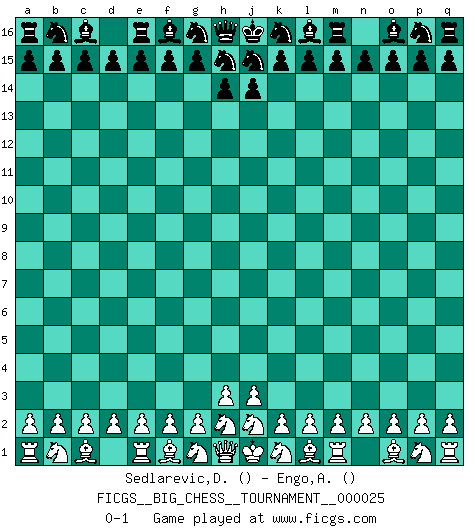 Last move : 0-1 2008 August 28 7:29:40 [Event "FICGS__BIG_CHESS__TOURNAMENT__000025"] [Site "FICGS"] [Date "2008.07.29"] [Round "1"] [White "Sedlarevic,Daniel"] [Black "Engo,Arne Sigvald"] [Result "0-1"] [WhiteElo ""] [BlackElo ""] 0-1 This big chess game has been lost on time (started : 2008.07.29 1:27:47) Follow this game move after move (download)In Chess, as it is played by masters, chance is practically eliminated. (Emanuel Lasker) Mein Gehirn das ist mein zweitwichtigstes Organ [Aus dem Film: Der Schläfer]. (Woody Allen) Cada Peón es potencialmente una Reina. (James Mason) Comme les marins qui ont mille raisons différentes d'aller en mer, les joueurs d'échecs en ont tout autant avant de s'installer devant une table et jouer... (Vincent Bertignac, philosophe) Wisdom is the reward you get for a lifetime of listening when you'd have preferred to talk. (Doug Larson)