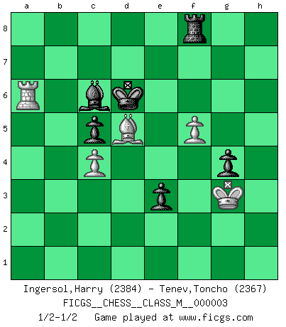 Last move : 1/2-1/2 2006 November 10 17:41:46 [Event "FICGS__CHESS__CLASS_M__000003"] [Site "FICGS"] [Date "2006.04.15"] [Round "1"] [White "Ingersol,Harry"] [Black "Tenev,Toncho"] [Result "1/2-1/2"] [WhiteElo "2384"] [BlackElo "2367"] 1.e4 c5 2.Nf3 Nc6 3.d4 cxd4 4.Nxd4 e5 5.Nb5 d6 6.N1c3 a6 7.Na3 Be7 8.Be3 b5 9.Nd5 Rb8 10.c4 b4 11.Nc2 Nf6 12.f3 b3 13.axb3 Rxb3 14.Be2 Rxb2 15.Qc1 Rb3 16.O-O O-O 17.Qd2 Qd7 18.Rfd1 Rd8 19.Qe1 Qe8 20.Rdb1 Rxb1 21.Qxb1 Qd7 22.Qb6 Bb7 23.Rb1 Rb8 24.Nxe7+ Qxe7 25.Nb4 Nd7 26.Nd5 Nxb6 27.Nxe7+ Nxe7 28.Rxb6 Nc6 29.Kf2 a5 30.Bd2 Kf8 31.Bd1 Ke7 32.Ba4 Nd8 33.Bb5 Ra8 34.Bc1 Rc8 35.Ba3 Bc6 36.Ra6 Kd7 37.Rxa5 Rc7 38.h3 Ne6 39.Ba6 g6 40.g4 Nd4 41.Bb2 Nb3 42.Ra3 Nc5 43.Bc3 Ke6 44.Bb4 f5 45.exf5+ gxf5 46.Bxc5 dxc5 47.Rb3 fxg4 48.hxg4 Rf7 49.Bc8+ Kd6 50.Rd3+ Kc7 51.Bf5 e4 52.Ra3 Kb6 53.f4 h5 54.Kg3 hxg4 55.Be6 Rf8 56.f5 Kc7 57.Ra7+ Kd6 58.Ra6 e3 59.Bd5 1/2-1/2 Sicilian : Labourdonnais-Loewenthal (Kalashnikov) variation Kingside Castling by player White (move 16) Kingside Castling by player Black (move 16) This chess game ended in a draw. Follow this game move after move (download)You are for me the Queen on d8 and I am the Pawn on d7 !! (Eduard Gufeld) Die Partien sind immer verschieden, die Interviews immer die gleichen. (Garry Kasparov) El Ajedrez no es una pizca de inferior al violín, y tenemos un gran número de violinistas profesionales. (Mikhail Botvinnik) Mon pion favori sur ma case favorite ! Bronstein en parlant d'un coup de pion en h5 quand il avait les Noirs. God, you are such an idiot. - Actually, I thought I was more of a jerk. (Gregory House to Stacy Warner, House M.D.)