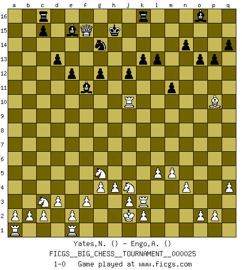 Last move : 1-0 2009 January 8 19:31:11 [Event "FICGS__BIG_CHESS__TOURNAMENT__000025"] [Site "FICGS"] [Date "2008.07.29"] [Round "1"] [White "Yates,Normajean"] [Black "Engo,Arne Sigvald"] [Result "1-0"] [WhiteElo ""] [BlackElo ""] 1.h3-h4 g15-g13 2.b1-c3 k16-l14 3.p1-o3 k15-k13 4.d2-d3 g16-f14 5.g2-g4 n15-n14 6.f1-p10 m15-m13 7.c1-k8 d15-d14 8.j2-k4 e15-e13 9.h1-o7 o15-o13 10.o7-f15 e16-e15 11.f15-o7 f14-h13 12.m2-m4 p16-n15 13.n2-n4 c16-f13 14.l1-p5 b16-d15 15.l2-l4 q15-q14 16.o7-f7 e15-f15 17.f7-b11 h16-f14 18.b11-b15 a16-b16 19.b15-a15 f13-d11 20.p10-l6 e13-e12 21.g1-f3 f14-c11 22.k8-c1 d14-d13 23.l4-l5 f16-d14 24.o1-d11 c11-d11 25.q1-n1 h13-f14 26.k1-l3 b16-f16 27.l6-k5 d11-c11 28.j1-j2 j14-j13 29.h2-j4 l14-k12 30.c1-h6 c11-k11 31.f3-g5 f14-g12 32.f2-f3 d15-e13 33.m1-m3 p15-p13 34.q2-q4 g12-h10 35.h6-g7 q16-q15 36.o3-n5 h10-j8 37.g7-j5 l15-l13 38.a15-h8 l16-f11 39.h8-h14 n15-l14 40.h14-h7 k12-j10 41.h7-n7 l14-m12 42.k5-n8 m12-l10 43.n1-n3 j15-h13 44.j4-k6 j8-k6 45.j5-k6 g13-g12 46.k4-j6 q15-n15 47.n5-m7 e13-g14 48.m7-n9 h13-k12 49.n9-l10 k12-l10 50.m4-m5 m13-m12 51.n3-o3 g14-h12 52.o3-o10 m12-m11 53.l3-j4 j13-j12 54.m3-k3 d14-e15 55.n7-c7 f16-c16 56.c7-c14 h15-f14 57.k6-c13 e15-c13 58.k3-k11 c13-e15 59.k11-k3 l10-k8 60.j6-k8 m16-k16 61.k8-j10 h12-j10 62.o10-j10 n15-j15 63.n8-p10 j16-h15 64.p5-g13 f14-h13 65.g13-j15 h13-j15 66.c14-e14 j15-g14 67.e14-f15 1-0 Follow this game move after move (download)He who fears an isolated Queen's Pawn should give up Chess. (Siegbert Tarrasch) Das Zentrum ist der Balkan des Schachbretts - Kriegshandlungen können in jedem Moment ausbrechen. (Aaron Nimzowitsch) No hay precio que sea tan grande por la cabellera del Rey enemigo. (Koblentz) Le moment que je préfère le plus dans une rencontre, c'est celui où je sens que la personnalité de l'adversaire se brise. (Robert Fischer) Who needs drugs and alcohol if he can play Big Chess at FICGS ? (Heinz-Georg Lehnhoff)