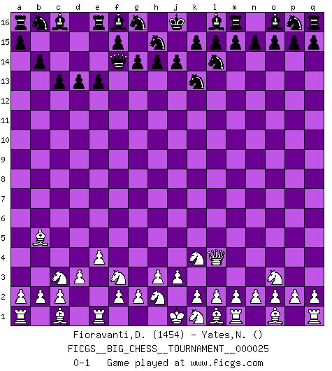 Last move : 0-1 2008 September 11 18:24:33 [Event "FICGS__BIG_CHESS__TOURNAMENT__000025"] [Site "FICGS"] [Date "2008.07.29"] [Round "1"] [White "Fioravanti,Diego"] [Black "Yates,Normajean"] [Result "0-1"] [WhiteElo "1454"] [BlackElo ""] 1.e2-e4 d15-d13 2.j2-k4 g15-g14 3.b1-c3 h16-f14 4.g1-f3 c15-c13 5.f1-b5 b15-b14 6.d2-d3 e15-e13 7.h1-l4 k16-l14 8.p1-o3 j15-k13 0-1 Follow this game move after move (download)A good player is always lucky. (Jose Raul Capablanca) Drei Punkte vor allen anderen ist wie einer, der im weißen Anzug posiert, während der Rest in Müllsäcke gekleidet dasteht. (Viktor Kortschnoi) Por tratar de evitar la pérdida de una pieza, muchas personas han perdido una partida de Ajedrez. (Savielly Tartakover) Il n'y a pas de prix trop élevé au scalp de l'ennemi. (Koblentz) Art is the triumph over chaos. (John Cheever)