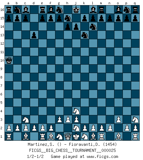 Last move : 1/2-1/2 2008 September 13 21:40:29 [Event "FICGS__BIG_CHESS__TOURNAMENT__000025"] [Site "FICGS"] [Date "2008.07.29"] [Round "1"] [White "Martinez,Silvio"] [Black "Fioravanti,Diego"] [Result "1/2-1/2"] [WhiteElo ""] [BlackElo "1454"] 1.b1-c3 j15-k13 2.h2-j4 h16-o10 3.p1-q3 d15-d13 4.g2-g3 k16-l14 5.o2-o3 o10-a10 1/2-1/2 Follow this game move after move (download)Modern Chess is too much concerned with things like Pawn structure. Forget it, Checkmate ends the game. (Nigel Short) Ein bischen Romantik kann weder im Schach noch in der Liebe schaden. Also versuche ich mich ab und zu daran zu erinnern. (Nigel Short) Los Peones son nacidos libres, y aún así, se encuentran encadenados por todos lados. (Rick Kennedy) Le génie consiste à savoir transgresser les règles au moment opportun. (Teichmann) The various flowers seem good to different people. (Chinese proverb)