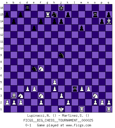Last move : 0-1 2008 November 3 7:37:19 [Event "FICGS__BIG_CHESS__TOURNAMENT__000025"] [Site "FICGS"] [Date "2008.07.29"] [Round "1"] [White "Lupinacci,Nicola"] [Black "Martinez,Silvio"] [Result "0-1"] [WhiteElo ""] [BlackElo ""] 1.d2-d4 d15-d13 2.j2-k4 e15-e13 3.n2-n4 k16-l14 4.g2-g4 b16-c14 5.h1-d5 m15-m14 6.d5-o15 p16-q14 7.o15-d5 n15-n13 8.d5-d13 c16-e14 9.d13-m5 j15-h13 10.b1-c3 g16-f14 11.p1-o3 h16-m12 12.m5-m12 l14-m12 13.h3-h4 f16-a11 14.m2-m4 f14-g12 15.h2-f3 e14-a10 16.f1-h3 m14-m13 17.g1-j2 l16-p12 18.e1-g1 o16-f8 19.k1-h2 f8-k4 20.j2-k4 g12-h10 21.h3-k5 h10-j8 22.k5-c12 a10-c12 23.o1-c12 f15-f14 24.c1-g5 a11-g5 25.f3-g5 e16-d16 26.h2-f3 h15-g13 27.l2-l4 q16-o16 28.k4-h5 p12-h5 29.g4-h5 c14-a13 30.c12-d11 g13-h15 31.d11-a8 j8-h6 32.l1-m2 h6-g4 33.g1-g4 d16-d8 34.a8-d5 a16-d16 35.e2-e4 m12-l10 36.m2-a13 b15-b14 37.a13-j5 h13-g11 38.j5-e9 d8-d11 39.g5-f7 g11-f9 40.e9-l15 m16-l16 41.l15-n13 p15-p14 42.n13-p15 o16-o15 43.p15-q14 l10-j9 44.g4-g15 d11-d15 45.a1-g1 d15-g15 46.g1-g15 f9-e7 47.d5-b3 l16-l4 0-1 Follow this game move after move (download)I give 98 percent of my mental energy to Chess. Others give only 2 percent. (Bobby Fischer) Alles was am Schachbrett zählt sind gute Züge. (Robert James Fischer) El Jaque al descubierto es el bombardero del tablero. (Reuben Fine) Plusieurs personnes se sont demandées comment Tal faisait pour gagner... En fait, c'est très simple ! Il met ses pièces au centre de l'échiquier et les sacrifie quelque part ! (David Bronstein) As a goal marker shodan is important. As a destination it is a poor place to stop. (Thomas Tamayo)