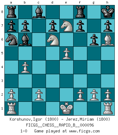 Last move : 1-0 2008 August 6 13:8:54 [Event "FICGS__CHESS__RAPID_B__000096"] [Site "FICGS"] [Date "2008.07.29"] [Round "1"] [White "Korshunov,Igor"] [Black "Jerez,Miriam"] [Result "1-0"] [WhiteElo "1800"] [BlackElo "1800"] 1.e4 e5 2.Nf3 Nf6 3.d4 exd4 4.e5 Nd5 5.Qxd4 c6 6.Bc4 Qa5+ 7.Bd2 Qb6 8.Bxd5 Qxd4 9.Nxd4 cxd5 10.Nb5 Na6 11.N1c3 Bc5 12.Nxd5 O-O 13.b4 Bb6 14.Ne7+ Kh8 15.Nd6 g6 16.Bh6 1-0 Petrov : Modern (Steinitz) attack Kingside Castling by player Black (move 12) Player White won this chess game. Follow this game move after move (download)Play the opening like a book, the middle game like a magician, and the endgame like a machine. (Spielmann) Die Partien sind immer verschieden, die Interviews immer die gleichen. (Garry Kasparov) Cuando tu casa esta en llamas, no puedes ser molestado por tus vecinos. O, como decinos en Ajedrez, si tu Rey esta bajo ataque, no te preocupa perder un Peón del lado de la Reina. (Gary Kasparov) Les ravages du H expliquent la différence de niveau entre Tal et Thal [Abergel]. Information on the Internet is subject to the same rules and regulations as conversation at a bar. (George Lundberg)