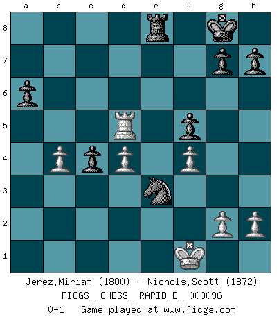 Last move : 0-1 2008 August 16 2:45:48 [Event "FICGS__CHESS__RAPID_B__000096"] [Site "FICGS"] [Date "2008.07.29"] [Round "1"] [White "Jerez,Miriam"] [Black "Nichols,Scott"] [Result "0-1"] [WhiteElo "1800"] [BlackElo "1872"] 1.d4 Nf6 2.Nc3 d5 3.f4 Bf5 4.e3 e6 5.Bd3 Bb4 6.Bd2 O-O 7.Nf3 c5 8.Bxf5 exf5 9.O-O Nc6 10.a3 Bxc3 11.Bxc3 c4 12.b4 a6 13.Ne5 Qe7 14.Nxc6 Qxe3+ 15.Rf2 bxc6 16.Qe1 Rfe8 17.Qxe3 Rxe3 18.Bd2 Re6 19.Re1 Ne4 20.Rfe2 Nxd2 21.Rxe6 fxe6 22.Rxe6 Nb1 23.Rxc6 Nxa3 24.c3 Nb5 25.Rc5 Nxc3 26.Kf1 Rb8 27.Ke1 Re8+ 28.Kf1 Nd1 29.Rxd5 Ne3+ 0-1 Queen's pawn game Kingside Castling by player Black (move 6) Kingside Castling by player White (move 9) Player Black won this chess game. Follow this game move after move (download)You need not play well - just help your opponent to play badly. (Genrikh Chepukaitis) Ich verstehe den Grund nicht, warum die Aufteilung in Frauen und Männer überhaupt im Schach besteht. (Judith Polgar) Con o sin el título, Bobby Fischer fue sin lugar a dudas el mas grande jugador de su época. (Burt Hochberg) Ce qui caractérise les parties de combat, c'est que si le défenseur a constamment de difficiles problèmes à résoudre, l'attaquant doit chercher sans relâche de nouvelles possibilités d'attaque. (Koblentz) The arrogant army will lose certainly the battle. (Chinese proverb)