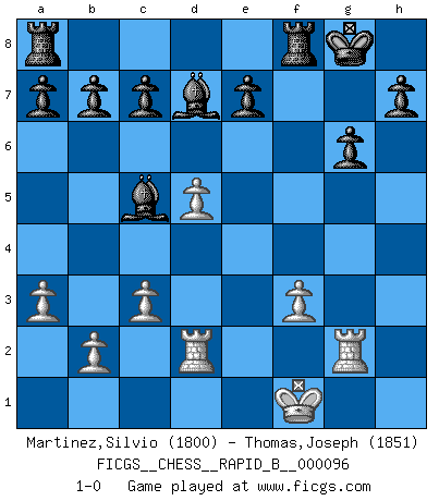 Last move : 1-0 2008 September 30 10:34:7 [Event "FICGS__CHESS__RAPID_B__000096"] [Site "FICGS"] [Date "2008.07.29"] [Round "1"] [White "Martinez,Silvio"] [Black "Thomas,Joseph"] [Result "1-0"] [WhiteElo "1800"] [BlackElo "1851"] 1.d4 f5 2.f4 Nf6 3.Nf3 g6 4.Ne5 Bg7 5.Nc3 d6 6.Nf3 O-O 7.e4 fxe4 8.Bc4+ d5 9.Bxd5+ Nxd5 10.Nxd5 Qxd5 11.Be3 exf3 12.Qxf3 Qxf3 13.gxf3 Nc6 14.Rd1 Nb4 15.c3 Nc2+ 16.Kf2 Nxe3 17.Kxe3 Bh6 18.Rhg1 Bxf4+ 19.Kf2 Bxh2 20.Rg2 Bd6 21.a3 Be6 22.d5 Bd7 23.Rd2 Bc5+ 24.Kf1 1-0 This chess game has been lost on time (started : 2008.07.29 13:20:6) Dutch Kingside Castling by player Black (move 6) Player White won this chess game. Follow this game move after move (download)I still hope to kill Fischer. (Boris Spassky) Irgendwie scheint mir sonntags früh um 9 Uhr der Killerinstinkt verloren gegangen zu sein. (Alexej Shirov) La esencia del Ajedrez es pensar acerca de lo que el Ajedrez es. (David Bronstein) Si rien de grave n'est détecté lors de l'analyse d'une position, on joue alors le coup. Seconde règle de Blumenfeld. If you are going through hell, keep going. (Winston Churchill)