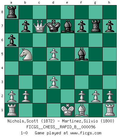 Last move : 1-0 2008 August 8 3:37:36 [Event "FICGS__CHESS__RAPID_B__000096"] [Site "FICGS"] [Date "2008.07.29"] [Round "1"] [White "Nichols,Scott"] [Black "Martinez,Silvio"] [Result "1-0"] [WhiteElo "1872"] [BlackElo "1800"] 1.e4 e5 2.Nf3 Nf6 3.Nxe5 Nxe4 4.Qe2 d5 5.d3 Nd6 6.Nc6 Kd7 7.Nxd8 Kxd8 8.c4 Nc6 9.cxd5 Nd4 10.Qd1 Bf5 11.Be3 Be7 12.Bxd4 Nb5 13.Bxg7 Rg8 14.Nc3 Rxg7 15.Nxb5 Kd7 16.Qc1 a6 17.Qxc7+ 1-0 Petrov : Damiano variation Player White won this chess game. Follow this game move after move (download)Who is your opponent tonight, tonight I am playing against the Black pieces. (Akiba Rubinstein) Zu meiner Zeit war ein 20 jähriger ein junger Spieler, heute ist er ein Veteran. (Garry Kasparov) El Ajedrez, como cualquier otra actividad creativa, puede existir solo a través de méritos combinados de aquellos que tienen talento creativo y de aquellos que tienen la habilidad de organizar un trabajo creativo. (Mikhail Botvinnik) On croit qu'il y a plus de mauvais joueurs que de bons joueurs, c'est faux : Il y a autant de joueurs qui gagnent que de joueurs qui perdent. (Philippe Geluck) Opportunities multiply as they are seized. (Sun Tzu)