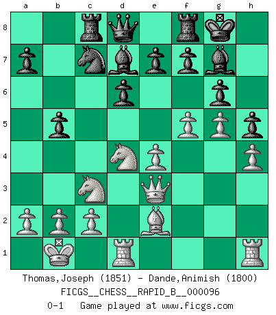 Last move : 0-1 2008 September 20 10:8:51 [Event "FICGS__CHESS__RAPID_B__000096"] [Site "FICGS"] [Date "2008.07.29"] [Round "1"] [White "Thomas,Joseph"] [Black "Dande,Animish"] [Result "0-1"] [WhiteElo "1851"] [BlackElo "1800"] 1.e4 c5 2.Nf3 d6 3.d4 cxd4 4.Nxd4 Nf6 5.Nc3 g6 6.Be3 Bg7 7.f3 Nc6 8.Qd2 Bd7 9.O-O-O O-O 10.Kb1 Rc8 11.g4 Ne5 12.h4 h5 13.g5 Ne8 14.Be2 Nc7 15.f4 Ng4 16.f5 Nxe3 17.Qxe3 b5 0-1 This chess game has been lost on time (started : 2008.07.29 13:20:6) Sicilian : Dragon, Yugoslav attack Queenside Castling by player White (move 9) Kingside Castling by player Black (move 9) Player Black won this chess game. Follow this game move after move (download)Chess is a terrible game. If you have no center, your opponent has a freer position. If you do have a center, then you really have something to worry about ! (Siegbert Tarrasch) Pläne sind die Träume des Verständigen. (Ernst Freiherr von Feuchtersleben) Bendita sea la memoria de aquel que dio al mundo este juego inmortal. (A. G. Gardiner) Il vaut mieux sacrifier les pièces de l'adversaire. (Xavier Tartacover) Follow your passion, and success will follow you. (Arthur Buddhold)