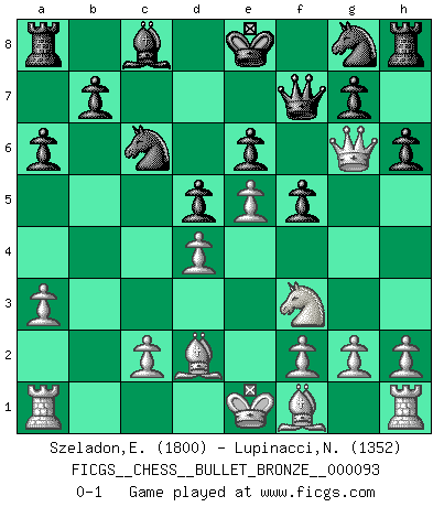 Last move : 0-1 2008 July 29 14:55:31 [Event "FICGS__CHESS__BULLET_BRONZE__000093"] [Site "FICGS"] [Date "2008.07.29"] [Round "1"] [White "Szeladon,Eremita"] [Black "Lupinacci,Nicola"] [Result "0-1"] [WhiteElo "1800"] [BlackElo "1352"] 1.e4 e6 2.d4 d5 3.Nc3 Bb4 4.e5 c5 5.a3 Bxc3+ 6.bxc3 Qc7 7.Qg4 f5 8.Qg3 Nc6 9.Nf3 cxd4 10.cxd4 a6 11.Bd2 h6 12.Qg6+ Qf7 0-1 This chess game has been lost on time (started : 2008.07.29 14:26:43) French : Winawer, Classical variation Player Black won this chess game. Follow this game move after move (download)A bad day of Chess is better than any good day at work. (Anonymous) Ihnen, Herr Lasker, habe ich nur drei Worte zu sagen: Schach und matt. (Siegbert Tarrasch) Ser exitoso en el Ajedrez te permite descubrir tu propia personalidad. Eso es lo que deseo para los niños de mi clase. (Saudin Robovic) Les échecs sont utiles à l'exercice de la faculté de penser et à celle de l'imagination. Car nous devons posséder une méthode élaborée pour atteindre des buts partout où nous devons conduire notre raison. (Leibnitz) Big Chess is a place for big hallucinations. (Thibault de Vassal)