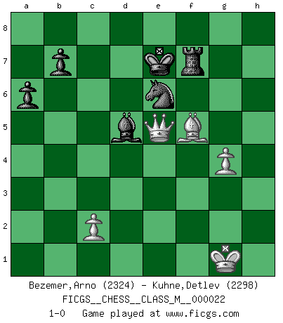 Last move : 1-0 2008 October 16 22:32:53 [Event "FICGS__CHESS__CLASS_M__000022"] [Site "FICGS"] [Date "2008.07.29"] [Round "1"] [White "Bezemer,Arno"] [Black "Kuhne,Detlev"] [Result "1-0"] [WhiteElo "2324"] [BlackElo "2298"] 1.e4 c5 2.Nf3 d6 3.d4 cxd4 4.Nxd4 Nf6 5.Nc3 a6 6.Bg5 e6 7.f4 Qb6 8.Qd2 Qxb2 9.Rb1 Qa3 10.e5 dxe5 11.fxe5 Nfd7 12.Ne4 h6 13.Bh4 Qxa2 14.Rd1 Qd5 15.Qe3 Qxe5 16.Be2 Bc5 17.Bg3 Bxd4 18.Rxd4 Qa5+ 19.Rd2 O-O 20.Bd6 Rd8 21.Qg3 Qf5 22.Be5 Qg6 23.Qh4 Nc6 24.Bh5 Qf5 25.Bxg7 Nc5 26.Nxc5 Kxg7 27.Rf1 Qe5+ 28.Ne4 Qa1+ 29.Rd1 Rxd1+ 30.Bxd1 Qe5 31.Rf6 Bd7 32.Qxh6+ Kg8 33.Rf4 f5 34.Rh4 Rd8 35.Rh3 Qxe4+ 36.Kf1 Qe5 37.Rg3+ Qxg3 38.hxg3 Be8 39.Bf3 Rd6 40.g4 fxg4 41.Be4 Rd7 42.Qxe6+ Kf8 43.Qxg4 Nd8 44.Qh4 Ne6 45.g4 Rf7+ 46.Kg1 Bc6 47.Bf5 Bd5 48.Qh8+ Ke7 49.Qe5 1-0 Sicilian : Najdorf, 7...Qb6 Kingside Castling by player Black (move 19) Player White won this chess game. Follow this game move after move (download)Chess is a foolish expedient for making idle people believe they are doing something very clever when they are only wasting their time. (George Bernard Shaw) Der Freibauer hat für mich eine Seele, genau wie der Mensch, Wünsche, die unerkannt in ihm schlummern, und Befürchtungen, von deren Existenz er selbst kaum ahnt. (Aaron Nimzowitsch) El jugador táctico debe saber que hacer cuando algo se debe de hacer. El estratégico debe saber que hacer cuando nada se debe de hacer. (Savielly Tartakover) Les réformistes prétendent que les progrès de la théorie conduiront à la disparition des échecs, et qu'il faut, pour leur rendre vie, en remanier les règles. En réalité, qu'exprime cette affirmation? Le mépris de l'intuition, de l'imagination et de tous les autres éléments qui font des échecs un art. (Alexander Alekhine) Luck has a peculiar habit of favoring those who don't depend on it. (Author unknown)