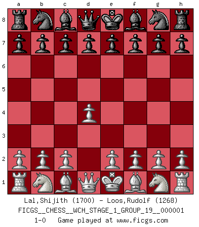 Last move : 1-0 2006 August 27 18:47:27 [Event "FICGS__CHESS__WCH_STAGE_1_GROUP_19__000001"] [Site "FICGS"] [Date "2006.07.27"] [Round "1"] [White "Lal,Shijith"] [Black "Loos,Rudolf"] [Result "1-0"] [WhiteElo "1700"] [BlackElo "1268"] 1.d4 1-0 This chess game has been lost on time (started : 2006.07.27 16:44:55) Queen's pawn Player White won this chess game. Follow this game move after move (download)The passed Pawn is a criminal, who should be kept under lock and key. Mild measures, such as police surveillance, are not sufficient. (Aaron Nimzovich) Ohne Leiden bildet sich kein Charakter. (Ernst Freiherr von Feuchtersleben) La batalla por la última verdad nunca sera ganada. Y es por eso que el Ajedrez es tan fascinante. (Hans Kmoch) On a dit que l'homme se distingue de l'animal par le fait qu'il achète plus de livres qu'il ne peut en lire. Je voudrais suggérer qu'inclure à la liste des livres quelques livres d'échecs rendrait la distinction manifeste. (Edward Lasker) Success without honor is an unseasoned dish; it will satisfy your hunger, but it won't taste good. (Joe Paterno)