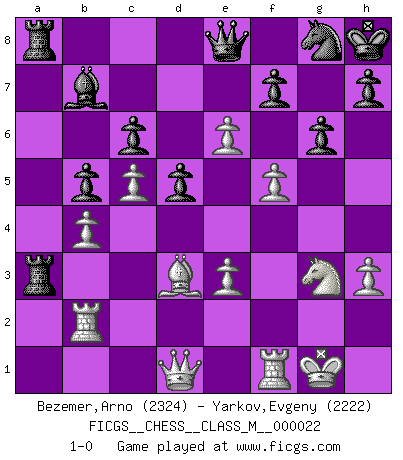 Last move : 1-0 2009 February 24 3:40:8 [Event "FICGS__CHESS__CLASS_M__000022"] [Site "FICGS"] [Date "2008.07.29"] [Round "1"] [White "Bezemer,Arno"] [Black "Yarkov,Evgeny"] [Result "1-0"] [WhiteElo "2324"] [BlackElo "2222"] 1.d4 d5 2.c4 c6 3.Nf3 Nf6 4.Nc3 a6 5.e3 b5 6.c5 Nbd7 7.Bd2 a5 8.Rc1 Ba6 9.a3 Qc7 10.b4 axb4 11.axb4 g6 12.Bd3 Bg7 13.O-O O-O 14.Ne2 Ra7 15.h3 Bb7 16.Bc3 Rfa8 17.Bb2 Qc8 18.Qb3 Nf8 19.Ne5 Qd8 20.f4 N8d7 21.Rc2 e6 22.g4 Qe8 23.Ng3 Kh8 24.Rcf2 Ng8 25.f5 exf5 26.gxf5 Nxe5 27.dxe5 Ra2 28.e6 Bxb2 29.Rxb2 R2a3 30.Qd1 1-0 QGD Slav : 4.Nc3 Kingside Castling by player White (move 13) Kingside Castling by player Black (move 13) Player White won this chess game. Follow this game move after move (download)Any material change in a position must come about by mate, a capture, or a Pawn promotion. (Purdy) Die meiste Zeit treffe ich auf Gegner, die meine Enkel sein könnten. Ich bin da, um ihnen zu zeigen, dass sie von mir noch einiges lernen können. (Viktor Kortschnoi) Un mal plan es mejor que no tener ningún plan. (Frank Marshall) Les échecs c'est le défi de l'alpiniste, toujours plus haut, prêt à tout pour monter à l'assaut du Roi ennemi. Les échecs, c'est de la musique en mouvement, un ballet majestueux pour les yeux. C'est de la poésie composée par les fantômes du passé qui au même titre que Rimbaud ou Verlaine méritent notre admiration. Les échecs, c'est de la peinture ou le moindre mouvement modifie le tableau pour en faire un Picasso ou un Van Gogh. Les échecs, c'est tout et rien, c'est la vie et la mort. Jjulie33 sur le forum de France-Echecs. Computers are like Old Testament gods; lots of rules and no mercy. (Joseph Campbell)