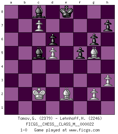 Last move : 1-0 2009 June 19 22:15:30 [Event "FICGS__CHESS__CLASS_M__000022"] [Site "FICGS"] [Date "2008.07.29"] [Round "1"] [White "Tomov,Georgi"] [Black "Lehnhoff,Heinz-Georg"] [Result "1-0"] [WhiteElo "2379"] [BlackElo "2246"] 1.e4 c5 2.Nf3 e6 3.c4 Nc6 4.Nc3 Nf6 5.Be2 Qb6 6.O-O Be7 7.a3 O-O 8.Rb1 a5 9.d3 d6 10.h3 Bd7 11.Be3 e5 12.Nh2 Nd4 13.f4 exf4 14.Bxf4 a4 15.Nf3 Rfe8 16.Nxd4 cxd4 17.Nd5 Nxd5 18.exd5 Qc5 19.b4 axb3 20.Qxb3 Bd8 21.Bg4 f5 22.Bh5 g6 23.Qxb7 Bc7 24.Qb4 Qa7 25.Bf3 Reb8 26.Qe1 Rxb1 27.Qxb1 Qxa3 28.Re1 Rb8 29.Qc1 Qxd3 30.c5 Qc3 31.Qxc3 dxc3 32.Re7 Rd8 33.c6 Bb6+ 34.Kf1 Bc8 35.Ke2 Ba6+ 36.Kd1 Bd3 37.Rb7 Bc5 38.c7 Rc8 39.Rb8 c2+ 40.Kd2 Ba6 41.Kxc2 Kf7 42.Rxc8 Bxc8 43.Bg5 Ke8 44.Be2 1-0 Sicilian defense Kingside Castling by player White (move 6) Kingside Castling by player Black (move 7) Player White won this chess game. Follow this game move after move (download)The battle for the ultimate truth will never be won. And that's why Chess is so fascinating. (Hans Kmoch) Es ist peinlich, dass ich nie Weltmeister wurde. Es wäre leicht, Leonid Breschnjew als Ursache vorzuschieben, dessen Apparat den Vorzeigekommunisten Anatoli Karpow in allem unterstützte. Aber Garri Kasparow zum Beispiel, der ebenfalls von den Sowjets unerwünscht war, hat trotz der Widerstände den WM-Titel erobert. (Viktor Kortschnoi) El Ajedrez lo es todo: arte, ciencia y deporte. (Anatoly Karpov) Un millionnaire : 'Monsieur Steinitz ! Vous ne participez aux tournois que pour l'argent, alors que moi je n'y viens que pour l'honneur.' Steinitz : 'Chacun joue pour ce qu'il n'a pas'... There are two kinds of people in the world, my friend. Those who have a loaded gun and those who dig. You dig ! (Blondie in The Good, The Bad and The Ugly)