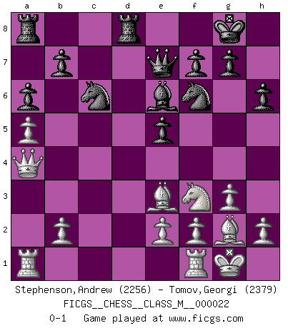 Last move : 0-1 2009 February 20 21:30:5 [Event "FICGS__CHESS__CLASS_M__000022"] [Site "FICGS"] [Date "2008.07.29"] [Round "1"] [White "Stephenson,Andrew"] [Black "Tomov,Georgi"] [Result "0-1"] [WhiteElo "2256"] [BlackElo "2379"] 1.d4 Nf6 2.c4 e6 3.g3 d5 4.Bg2 dxc4 5.Nf3 Nc6 6.Qa4 Bb4+ 7.Bd2 Bd6 8.O-O O-O 9.Nc3 e5 10.d5 Ne7 11.Bg5 Nd7 12.Qxc4 h6 13.Bd2 a6 14.a4 c6 15.dxc6 Nxc6 16.Ne4 Nf6 17.Nxd6 Qxd6 18.a5 Rd8 19.Be3 Be6 20.Qa4 Qe7 0-1 This chess game has been lost on time (started : 2008.07.29 20:18:32) Catalan : Open, 5.Nf3 Kingside Castling by player White (move 8) Kingside Castling by player Black (move 8) Player Black won this chess game. Follow this game move after move (download)Chess books should be used as we use glasses: to assist the sight, although some players make use of them as if they thought they conferred sight. (Jose Raul Capablanca) Wenn ich gewinne bin ich ein Genie. Wenn nicht, dann bin ich keines. (Robert James Fischer) Ayuda a tus piezas para que ellas te puedan ayudar. (Paul Morphy) La vérité est comme le meilleur coup aux échecs : elle existe, mais il faut la chercher. (Arturo Perez-Reverte) The good fighters of old first put themselves beyond the possibility of defeat, and then waited for an opportunity of defeating the enemy. (Sun Tzu)