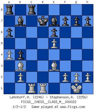 Last move : 1/2-1/2 2008 August 22 18:33:29 [Event "FICGS__CHESS__CLASS_M__000022"] [Site "FICGS"] [Date "2008.07.29"] [Round "1"] [White "Lehnhoff,Heinz-Georg"] [Black "Stephenson,Andrew"] [Result "1/2-1/2"] [WhiteElo "2246"] [BlackElo "2256"] 1.d4 d5 2.c4 dxc4 3.Nf3 Nf6 4.e3 e6 5.Bxc4 c5 6.O-O a6 7.Bb3 b5 8.a4 b4 9.e4 Bb7 10.e5 Ne4 11.Nbd2 Nxd2 12.Bxd2 Nc6 13.Be3 cxd4 14.Nxd4 Nxd4 15.Qxd4 Qxd4 16.Bxd4 Be7 17.Rac1 Kd7 18.Rfd1 Rhc8 19.Be3 1/2-1/2 QGA : Classical, 6...a6 Kingside Castling by player White (move 6) This chess game ended in a draw. Follow this game move after move (download)Bobby is the finest Chess player this country ever produced. His memory for the moves, his brilliance in dreaming up combinations, and his fierce determination to win are uncanny. (John Collins) Schach sollte überall auf der Welt Schulfach werden. Es fördert die geistige Auseinandersetzung. Es lehrt die Demut in der Niederlage. (Garry Kasparov) Cuando estes solo, cuando te sientas un extraño en el mundo, juega al Ajedrez. Esto levantará tu espiritu y será tu consejero de guerra. (Aristóteles) Plusieurs personnes se sont demandées comment Tal faisait pour gagner... En fait, c'est très simple ! Il met ses pièces au centre de l'échiquier et les sacrifie quelque part ! (David Bronstein) Vladimir Ras-Putin is still alive... He is also a good actor, I saw him in the Lord of the Rings. (Rodolfo d'Ettorre)