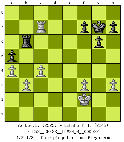 Last move : 1/2-1/2 2009 April 9 10:21:34 [Event "FICGS__CHESS__CLASS_M__000022"] [Site "FICGS"] [Date "2008.07.29"] [Round "1"] [White "Yarkov,Evgeny"] [Black "Lehnhoff,Heinz-Georg"] [Result "1/2-1/2"] [WhiteElo "2222"] [BlackElo "2246"] 1.e4 c5 2.Nf3 e6 3.d4 cxd4 4.Nxd4 Nc6 5.Nc3 Qc7 6.Be2 a6 7.O-O Nf6 8.Be3 Bb4 9.Na4 Be7 10.Nxc6 bxc6 11.Nb6 Rb8 12.Nxc8 Qxc8 13.Bd4 c5 14.Be5 Rb6 15.Qd3 d6 16.Bc3 O-O 17.b3 d5 18.exd5 Nxd5 19.Be5 Rd8 20.Qg3 Bf6 21.Bxf6 Nxf6 22.Rfd1 Nd5 23.Rd2 Nb4 24.Rxd8+ Qxd8 25.Rd1 Qe7 26.c3 Nd5 27.Qd3 g6 28.Bf3 Nf6 29.h3 Kg7 30.Qd8 Qxd8 31.Rxd8 e5 32.Rc8 e4 33.Be2 e3 34.Rxc5 exf2+ 35.Kf1 Ne4 36.Rc7 Rd6 37.a4 a5 38.Bf3 Nd2+ 39.Kxf2 Nxf3 40.gxf3 Rb6 41.c4 1/2-1/2 Sicilian : Taimanov (Bastrikov) variation Kingside Castling by player White (move 7) Kingside Castling by player Black (move 16) This chess game ended in a draw. Follow this game move after move (download)You know you're going to lose. Even when I was ahead I knew I was going to lose. - On playing against Fischer. (Andrew Soltis) In Buenos Aires ist es nicht mein vorrangiges Ziel ein starkes Turnier zu organisieren, sondern ein Turnier für Gentlemen. Ich würde nie Kamsky einladen. Ich mag keine Probleme. (Miguel Najdorf) El tablero es el mundo, las piezas es el fenomeno del universo, las reglas del juego son lo que llamamos leyes de la naturaleza y el jugador del lado opuesto, se encuentra oculto a nuestra vista. (Thomas Huxley) Les échecs sont un jeu terrible. Si vous n'avez pas le centre, votre adversaire a une position plus libre. Par contre, si vous avez le centre, alors vous avez vraiment quelque chose pour laquelle vous inquiéter ! (Siegbert Tarrasch) The modern world has divided itself into Conservatives and Progressives. The business of Progressives is to go on making mistakes. The business of the Conservatives is to prevent the mistakes from being corrected. (G.K. Chesterton)