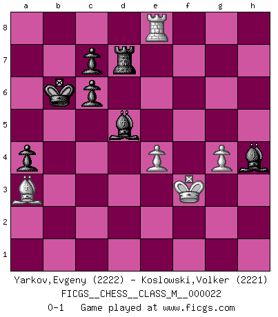 Last move : 0-1 2009 March 15 22:53:7 [Event "FICGS__CHESS__CLASS_M__000022"] [Site "FICGS"] [Date "2008.07.29"] [Round "1"] [White "Yarkov,Evgeny"] [Black "Koslowski,Volker"] [Result "0-1"] [WhiteElo "2222"] [BlackElo "2221"] 1.e4 e5 2.Nf3 Nc6 3.d4 exd4 4.Nxd4 Nf6 5.Nxc6 bxc6 6.e5 Qe7 7.Qe2 Nd5 8.c4 Ba6 9.b3 O-O-O 10.g3 g5 11.Bb2 Bg7 12.Nd2 Nb4 13.Nf3 Rhe8 14.a3 g4 15.axb4 gxf3 16.Qe3 Qxb4+ 17.Bc3 Rxe5 18.Bxb4 Rxe3+ 19.fxe3 Bxa1 20.Bh3 Be5 21.O-O Kb7 22.Rxf3 d5 23.Be7 Re8 24.Rxf7 dxc4 25.bxc4 Bxc4 26.Rxh7 a5 27.Bd7 Ra8 28.g4 a4 29.Ba3 Kb6 30.Kf2 Rd8 31.h4 Bg8 32.Re7 Bf6 33.Re8 Bxh4+ 34.Kf3 Bd5+ 35.e4 Rxd7 0-1 This chess game has been lost on time (started : 2008.07.29 20:18:32) Scotch : Mieses variation Queenside Castling by player Black (move 9) Kingside Castling by player White (move 21) Player Black won this chess game. Follow this game move after move (download)Botvinnik tried to take the mystery out of Chess, always relating it to situations in ordinary life. He used to call Chess a typical inexact problem similar to those which people are always having to solve in everyday life. (Garry Kasparov) Die Neutralität betrachte ich als eine schwere Krankheit. (Viktor Kortschnoi) El arma más poderosa en el Ajedrez, es tener la próxima movida. (David Bronstein) Une platitude souvent récitée à propos des Echecs est qu'une des choses les plus difficiles à réaliser est de gagner une position gagnante. Cela ne manque pas de sens mais, pour ma part, j'ai toujours trouvé plus difficile de gagner une position perdante. (Tim Krabbe) Patience, use the Force, think ! (Obi-Wan Kenobi in Star Wars ep.2)