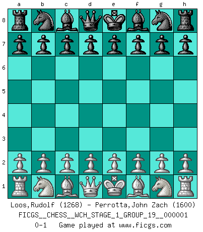 Last move : 0-1 2006 August 26 18:45:33 [Event "FICGS__CHESS__WCH_STAGE_1_GROUP_19__000001"] [Site "FICGS"] [Date "2006.07.27"] [Round "1"] [White "Loos,Rudolf"] [Black "Perrotta,John Zach"] [Result "0-1"] [WhiteElo "1268"] [BlackElo "1600"] 0-1 This chess game has been lost on time (started : 2006.07.27 16:44:55) Player Black won this chess game. Follow this game move after move (download)A man that will take back a move at Chess will pick a pocket. (Richard Fenton) Schach ist eine Sache der genauen Beurteilung, wann man zuschlagen und wann man sich ducken muss. (Robert James Fischer) ¿Esta Bobby Fischer algo cuerdo?. (Salo Flohr) Le succès, c'est être capable d'aller d'échec en échec sans perdre son enthousiasme. (Winston Churchill) The difference between perseverance and obstinacy is that one comes from a strong will, and the other from a strong won't. (Henry Ward Beecher)