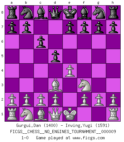 Last move : 1-0 2008 September 11 9:35:43 [Event "FICGS__CHESS__NO_ENGINES_TOURNAMENT__000009"] [Site "FICGS"] [Date "2008.07.30"] [Round "1"] [White "Gurgui,Dan"] [Black "Inving,Yugi"] [Result "1-0"] [WhiteElo "1400"] [BlackElo "1591"] 1.e4 c6 2.Nf3 d5 3.Bd3 1-0 This chess game has been lost on time (started : 2008.07.30 14:47:34) Caro-Kann defense Player White won this chess game. Follow this game move after move (download)Chess is not like life... it has rules ! (Mark Pasternak) Weshalb minderdergeübte Spieler mit g2-g4 beginnen? Die betreffenden sind unschlüssig, ob sie nun rechts (h4) oder links (f4) beginnen sollen, und in ihrer Ratlosigkeit entschliessen sie sich nach guter Bürgerart dazu, den goldenen Mittelweg zu wählen. (Aaron Nimzowitsch) El Ajedrez no es una pizca de inferior al violín, y tenemos un gran número de violinistas profesionales. (Mikhail Botvinnik) Des idées, des idées, j'en ai cent, j'en ai mille. Des bonnes, des mauvaises, applicables, irréalisables... Il suffit de faire le tri ! (Roos) If you know the enemy and know yourself you need not fear the results of a hundred battles. (Sun Tzu)