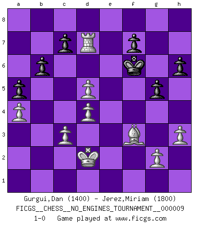 Last move : 1-0 2008 October 30 0:53:56 [Event "FICGS__CHESS__NO_ENGINES_TOURNAMENT__000009"] [Site "FICGS"] [Date "2008.07.30"] [Round "1"] [White "Gurgui,Dan"] [Black "Jerez,Miriam"] [Result "1-0"] [WhiteElo "1400"] [BlackElo "1800"] 1.e4 e5 2.f4 b6 3.Nf3 Nf6 4.Qe2 Nc6 5.fxe5 Be7 6.exf6 Bxf6 7.c3 O-O 8.d3 Ba6 9.b4 Ne5 10.Nxe5 Bxe5 11.Ba3 d5 12.b5 Bxb5 13.Bxf8 Qxf8 14.a4 Bd7 15.exd5 Qe8 16.d4 Bf6 17.Qxe8+ Rxe8+ 18.Kd1 a5 19.Nd2 Bg4+ 20.Nf3 Re3 21.Kd2 Re7 22.Be2 h6 23.h3 Bxf3 24.Bxf3 g5 25.Rhe1 Rxe1 26.Rxe1 Bd8 27.Re8+ Kg7 28.Rxd8 Kf6 29.Rd7 1-0 King's gambit Kingside Castling by player Black (move 7) Player White won this chess game. Follow this game move after move (download)An attack on the wing should be met by play in the center. (Nimzovitch) Je mehr wir mit Computern analysieren, desto mehr glauben wir an Verteidigung. (Vladimir Kramnik) Bobby Fischer es el mas grande genio de Ajedrez de todos los tiempos. (Alexander Kotov) C'est la seule position que je connaisse où les deux camps sont mals. Propos prêtés à V. Anand. He who laughs last probably does not get the joke. (Unknown)