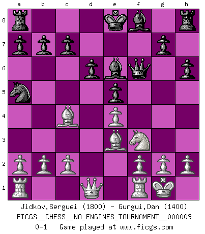 Last move : 0-1 2008 October 21 12:29:13 [Event "FICGS__CHESS__NO_ENGINES_TOURNAMENT__000009"] [Site "FICGS"] [Date "2008.07.30"] [Round "1"] [White "Jidkov,Serguei"] [Black "Gurgui,Dan"] [Result "0-1"] [WhiteElo "1800"] [BlackElo "1400"] 1.e4 e5 2.Nf3 f5 3.Nc3 Nf6 4.d3 fxe4 5.dxe4 d6 6.Bc4 h6 7.O-O Nc6 8.Nd5 Be6 9.Be3 Na5 10.Nxf6+ Qxf6 0-1 Latvian counter-gambit Kingside Castling by player White (move 7) Player Black won this chess game. Follow this game move after move (download)Spassky will not be psyched out by Fischer. (Mike Goodall) Computer sind die einzigen Gegner, die nicht immer eine Ausrede auf Lager haben, wenn sie gegen mich verlieren. (Robert James Fischer) No todos los artistas son jugadores de Ajedrez, pero todos los jugadores de Ajedrez son artistas. (Marcel Duchamp) Les échecs, c'est l'art d'analyser. (Mikhail Botvinnik) Winning isn't everything... but losing is nothing. (Mednis)