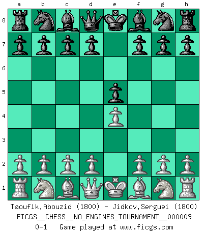 Last move : 0-1 2008 September 10 9:1:17 [Event "FICGS__CHESS__NO_ENGINES_TOURNAMENT__000009"] [Site "FICGS"] [Date "2008.07.30"] [Round "1"] [White "Taoufik,Abouzid"] [Black "Jidkov,Serguei"] [Result "0-1"] [WhiteElo "1800"] [BlackElo "1800"] 1.e4 e5 0-1 This chess game has been lost on time (started : 2008.07.30 14:47:34) King's pawn game Player Black won this chess game. Follow this game move after move (download)Could we look into the head of a Chess player, we should see there a whole world of feelings, images, ideas, emotion and passion. (Alfred Binet) Es hat in meinem Leben Zeiten gegeben, in denen das Schachspiel, wenn nicht zum Lebenszweck, so doch zu einem regelrechten Lebensersatz geworden ist. Man fühlt sich in solchen Zeiten nicht so, als besäße man eine göttliche Gabe, sondern eher so, als sei man von ihr besessen. (Garry Kasparov) Una compensación adecuada por un sacrificio es tener una combinación sólida que conduce a una posición ganadora; una compensación adecuada por una metida de pata es dejar a tu oponente arrebatar una derrota de las fauces de la victoria. (Bruce A. Moon) Si rien de grave n'est détecté lors de l'analyse d'une position, on joue alors le coup. Seconde règle de Blumenfeld. If you work for a living, why do you kill yourself working ? (Tuco to a chicken in The Good, The Bad and The Ugly)