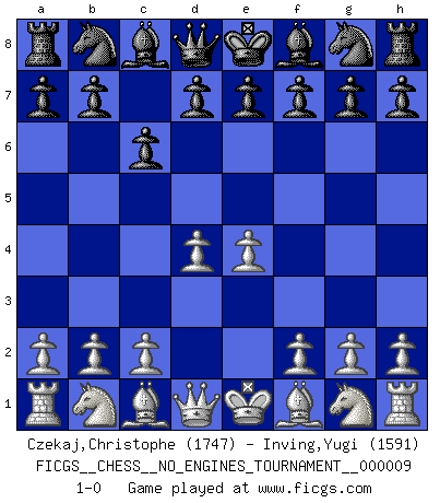 Last move : 1-0 2008 September 13 9:42:13 [Event "FICGS__CHESS__NO_ENGINES_TOURNAMENT__000009"] [Site "FICGS"] [Date "2008.07.30"] [Round "1"] [White "Czekaj,Christophe"] [Black "Inving,Yugi"] [Result "1-0"] [WhiteElo "1747"] [BlackElo "1591"] 1.d4 c6 2.e4 1-0 This chess game has been lost on time (started : 2008.07.30 14:47:34) Queen's pawn Player White won this chess game. Follow this game move after move (download)Chess is 99 percent tactics. (Teichmann) Dieses schreckliche Gefühl, dass ich gegen eine Maschine spielte, die niemals Fehler macht, zerschmetterte meinen Widerstand. (Mark Taimanov) Observen a Garry Kasparov. Después de una derrota, invariablemente el gana la próxima partida. Prácticamente hace pedazos a su siguiente oponente. Eso es algo que tenemos que aprender a lograr. (Maurice Ashley) Je menace de comprendre la position. (Anonyme) Perhaps chess is the wrong game for the times (The Chess Master and the Computer, by Garry Kasparov - 2010)