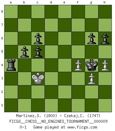 Last move : 0-1 2008 December 3 0:34:23 [Event "FICGS__CHESS__NO_ENGINES_TOURNAMENT__000009"] [Site "FICGS"] [Date "2008.07.30"] [Round "1"] [White "Martinez,Silvio"] [Black "Czekaj,Christophe"] [Result "0-1"] [WhiteElo "1800"] [BlackElo "1747"] 1.e4 g6 2.d4 Bg7 3.Nf3 d6 4.Nc3 a6 5.g3 b5 6.Bg2 Bb7 7.O-O Nd7 8.Bd2 e6 9.d5 Ngf6 10.dxe6 fxe6 11.b4 Nxe4 12.Re1 Nxc3 13.Bxc3 Bxc3 14.Rxe6+ Kf7 15.Re3 Bxa1 16.Qxa1 Qf6 17.Qxf6+ Kxf6 18.h4 Rae8 19.Rxe8 Rxe8 20.Ng5 h6 21.Nh3 Bxg2 22.Kxg2 Re2 23.a3 Rxc2 24.Kf3 Rc3+ 25.Ke4 c6 26.Nf4 Rxa3 27.f3 a5 28.bxa5 Rxa5 29.Nd3 Nc5+ 30.Nxc5 dxc5 31.f4 Ra4+ 32.Kd3 Kf5 33.Kc3 Kg4 0-1 Robatsch (Modern) defense Kingside Castling by player White (move 7) Player Black won this chess game. Follow this game move after move (download)I look one move ahead... the best ! (Siegbert Tarrasch) Wer sich die Fähigkeit anerziehen will im Schach selbstständig zu denken, der muß alles meiden, was leblos ist: ausgeklügelte Theorien, die sich auf sehr wenige Beispiele und eine Menge Hirngespinste stützen. (Emanuel Lasker) Los tropiezos estan todos ahí en el tablero, esperando que se cometan. (Savielly Tartakover) L'action d'une oeuvre littéraire se déroule sur un champ de bataille. Les masques et les types du drame moderne correspondent aux pièces du jeu d'échecs. L'intrigue correspond aux coups et aux gambits, c'est à dire aux techniques du jeu telles qu'utilisées et interprétées par les joueurs. Les tactiques et les péripéties [mouvements] correspondent aux coups exécutés par l'adversaire. (Viktor Shklovsky) Macintosh - we might not get everything right, but at least we knew the century was going to end. (Douglas Adams)