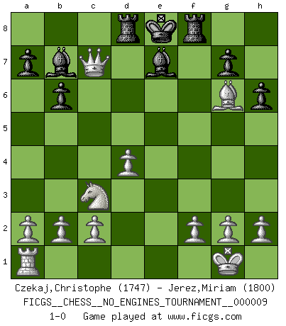 Last move : 1-0 2008 November 23 21:42:8 [Event "FICGS__CHESS__NO_ENGINES_TOURNAMENT__000009"] [Site "FICGS"] [Date "2008.07.30"] [Round "1"] [White "Czekaj,Christophe"] [Black "Jerez,Miriam"] [Result "1-0"] [WhiteElo "1747"] [BlackElo "1800"] 1.d4 d5 2.Nc3 Nf6 3.Bg5 Nbd7 4.e3 h6 5.Bxf6 Nxf6 6.Nf3 Ne4 7.Nxe4 dxe4 8.Nd2 f6 9.Nxe4 e6 10.Qh5+ Ke7 11.Bd3 Qe8 12.Qe2 b6 13.O-O Bb7 14.Nc3 f5 15.e4 Rd8 16.exf5 Kf6 17.Qe5+ Kf7 18.fxe6+ Qxe6 19.Qxc7+ Qe7 20.Bc4+ Kg6 21.Bd3+ Kf6 22.Qf4+ Ke6 23.Rfe1+ Kd7 24.Bf5+ Ke8 25.Rxe7+ Bxe7 26.Qc7 Rf8 27.Bg6+ 1-0 Richter-Veresov attack Kingside Castling by player White (move 13) Player White won this chess game. Follow this game move after move (download)The older I grow, the more I value Pawns. (Keres) Es hat in meinem Leben Zeiten gegeben, da ich sehr nahe daran war zu glauben, daß ich auch nicht eine einzige Schachpartie verlieren könnte. (José Raúl Capablanca) Combinaciones deslumbrantes son para la mayoría, mover madera es para los pocos. (Georg Kieninger) A ce moment-là, je menaçais de comprendre la position ! (Clément L'Heureux) Knowledge will give you power, but character respect. (Bruce Lee)