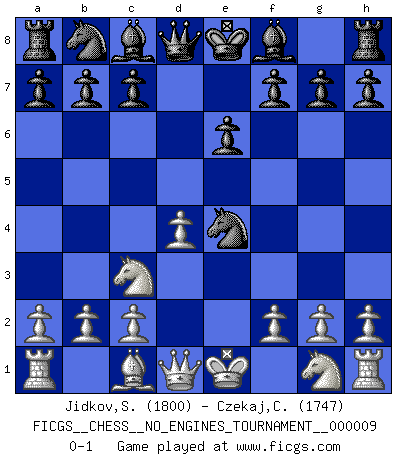 Last move : 0-1 2008 October 19 0:17:26 [Event "FICGS__CHESS__NO_ENGINES_TOURNAMENT__000009"] [Site "FICGS"] [Date "2008.07.30"] [Round "1"] [White "Jidkov,Serguei"] [Black "Czekaj,Christophe"] [Result "0-1"] [WhiteElo "1800"] [BlackElo "1747"] 1.e4 e6 2.d4 d5 3.Bd3 dxe4 4.Bxe4 Nf6 5.Nc3 Nxe4 0-1 French : Schlechter variation Player Black won this chess game. Follow this game move after move (download)Chess is no whit inferior to the violin, and we have a large number of professional violinists. (Mikhail Botvinnik) Gegen einen Schachcomputer zu verlieren ist wie Löcher in den Strümpfen zuhaben. Es ist nicht peinlich, solange man der einzige ist der es weiß. (Anonymous) Es muy difícil jugar en contra de la teoría de Einstein. - en su primera derrota en contra de Fischer (Mikhail Tal) Les Echecs mettent en conflit, non pas deux intelligences, mais deux volontés. (Lasker) Home computers are being called upon to perform many new functions, including the consumption of homework formerly eaten by the dog. (Doug Larson)
