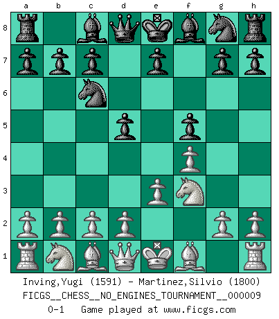 Last move : 0-1 2008 September 10 9:1:17 [Event "FICGS__CHESS__NO_ENGINES_TOURNAMENT__000009"] [Site "FICGS"] [Date "2008.07.30"] [Round "1"] [White "Inving,Yugi"] [Black "Martinez,Silvio"] [Result "0-1"] [WhiteElo "1591"] [BlackElo "1800"] 1.f4 d5 2.Nf3 f5 3.e3 Nc6 0-1 This chess game has been lost on time (started : 2008.07.30 14:47:34) Bird's Opening Player Black won this chess game. Follow this game move after move (download)No other master has such a terrific will to win. At the board he radiates danger, and even the strongest opponents tend to freeze, like rabbits when they smell a panther. Even his weaknesses are dangerous. As white, his opening game is predictable - you can make plans against it - but so strong that your plans almost never work. In the middle game his precision and invention are fabulous, and in the end game you simply cannot beat him. (Anonymous German Expert) Wer der Ansicht ist, daß alle Schachspieler verrückt sind, wird durch Studium des Lebens von Emil Josef Diemer nicht auf andere Gedanken kommen. (Hans Ree) La mitad de las variaciones que son calculadas en una partida de torneo, resultan ser completamente superfluas. Desafortunadamente, nadie sabe por adelantado cual mitad. (Jan Tinman) Les échecs sont un jeu terrible. Si vous n'avez pas le centre, votre adversaire a une position plus libre. Par contre, si vous avez le centre, alors vous avez vraiment quelque chose pour laquelle vous inquiéter ! (Siegbert Tarrasch) All the biggest technological inventions created by man - the airplane, the automobile, the computer - says little about his intelligence, but speaks volumes about his laziness. (Mark Kennedy)