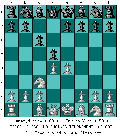Last move : 1-0 2008 September 10 21:3:39 [Event "FICGS__CHESS__NO_ENGINES_TOURNAMENT__000009"] [Site "FICGS"] [Date "2008.07.30"] [Round "1"] [White "Jerez,Miriam"] [Black "Inving,Yugi"] [Result "1-0"] [WhiteElo "1800"] [BlackElo "1591"] 1.e4 c6 2.d4 d5 3.Nc3 1-0 This chess game has been lost on time (started : 2008.07.30 14:47:34) Caro-Kann defense Player White won this chess game. Follow this game move after move (download)All that matters on the Chessboard is good moves. (Bobby Fischer) Viele Opfer benötigen überhaupt keine konkrete Berechnung. Es genügt sich die entstehende Position kurz vorzustellen, um uns davon zu überzeugen, dass das Opfer korrekt ist. (Mikhail Nekhemyevich Tal) Mi estilo es algo parecido entre un poco de Tal y Petrosian. (Reshevsky) Il n'y a pas eu de défaite parce que je ne crois pas que cet ordinateur ait jamais existé. IBM a triché en refusant d'imprimer les modes de recherche de la machine. C'est évident, pendant le match, des coups décisifs ont été joués par des êtres humains. Aujourd'hui, les meilleurs spécialistes en informatique ne peuvent toujours pas expliquer comment Deep-Blue a pu jouer contre la logique des ordinateurs. IBM a gagné une guerre de communication, mais ils sont incapables de prouver que l'ordinateur a gagné tout seul. (Garry Kasparov) You cannot beat a roulette table unless you steal money from it. (Albert Einstein)