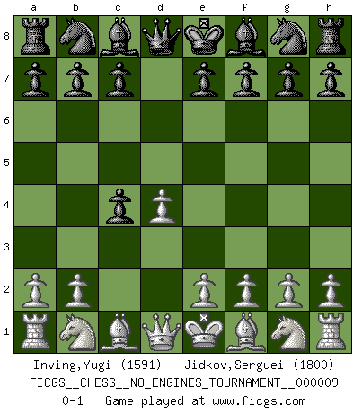 Last move : 0-1 2008 September 10 21:3:39 [Event "FICGS__CHESS__NO_ENGINES_TOURNAMENT__000009"] [Site "FICGS"] [Date "2008.07.30"] [Round "1"] [White "Inving,Yugi"] [Black "Jidkov,Serguei"] [Result "0-1"] [WhiteElo "1591"] [BlackElo "1800"] 1.d4 d5 2.c4 dxc4 0-1 This chess game has been lost on time (started : 2008.07.30 14:47:34) Queen's gambit accepted Player Black won this chess game. Follow this game move after move (download)I prefer to lose a really good game than to win a bad one. (David Levy) Die Partien sind immer verschieden, die Interviews immer die gleichen. (Garry Kasparov) Solo el jugador con la iniciativa tiene el derecho a atacar. (Wilhelm Steinitz) Les ravages du H expliquent la différence de niveau entre Tal et Thal [Abergel]. He is a liar. I just don't know what the lie is yet. (Horatio Caine, C.S.I. Miami)