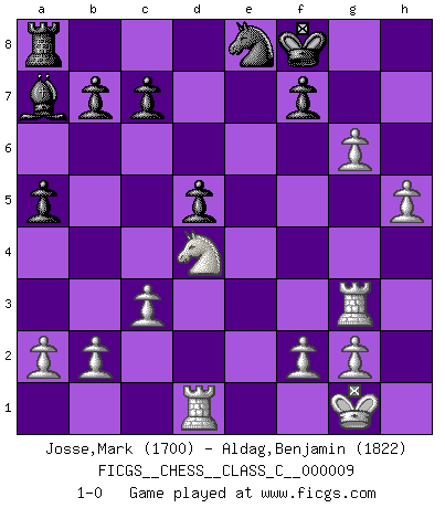 Last move : 1-0 2006 November 12 4:12:25 [Event "FICGS__CHESS__CLASS_C__000009"] [Site "FICGS"] [Date "2006.08.01"] [Round "1"] [White "Josse,Mark"] [Black "Aldag,Benjamin"] [Result "1-0"] [WhiteElo "1700"] [BlackElo "1822"] 1.e4 e5 2.Nf3 Nc6 3.Bc4 Bc5 4.c3 Nf6 5.d3 O-O 6.O-O d6 7.Bb3 a6 8.Nbd2 Ba7 9.h3 Ne7 10.Re1 Ng6 11.Nf1 Be6 12.Ng3 h6 13.d4 Qd7 14.Be3 Bxb3 15.Qxb3 Rfe8 16.Rad1 Qc6 17.Qc2 a5 18.dxe5 Nxe5 19.Nd4 Qc4 20.Ngf5 Ng6 21.Bxh6 gxh6 22.Qc1 Re5 23.Qxh6 Ne8 24.h4 d5 25.h5 Nh4 26.Qg5+ Kh8 27.Qf4 Rxf5 28.Qh6+ Kg8 29.exf5 Qc5 30.Re3 Qf8 31.Rg3+ Ng6 32.Qxf8+ Kxf8 33.fxg6 1-0 Giuoco Piano Kingside Castling by player Black (move 5) Kingside Castling by player White (move 6) Player White won this chess game. Follow this game move after move (download)In life, as in Chess, one's own Pawns block one's way. A man's very wealth, ease, leisure, children, books, which should help him to win, more often checkmate him. (Charles Buxton) Wenn Du nicht kämpfst, um anderen etwas zu beweisen, sondern nur für Dich selbst, dann bist du fast unbesiegbar. (Garry Kasparov) Para mi, el Ajedrez es la vida y cada partida es como una nueva vida. Todo jugador de Ajedrez suele vivir muchas vidas durante su vida. (Eduard Gufeld) J'apprécie les joueurs d'est-indienne, c'est grâce à eux que je nourris ma famille depuis tant d'années. (Petrosian) Man is reluctant to give credit for intelligence to anyone, except his enemies. (Albert Einstein)