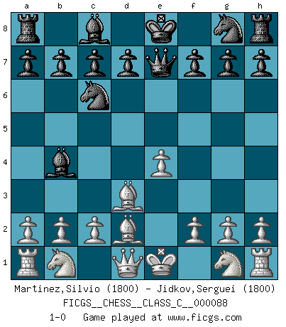 Last move : 1-0 2008 October 7 10:55:8 [Event "FICGS__CHESS__CLASS_C__000088"] [Site "FICGS"] [Date "2008.07.30"] [Round "1"] [White "Martinez,Silvio"] [Black "Jidkov,Serguei"] [Result "1-0"] [WhiteElo "1800"] [BlackElo "1800"] 1.e4 e5 2.d4 exd4 3.Qxd4 Nc6 4.Qd1 Bb4+ 5.Bd2 Qe7 6.Bd3 1-0 This chess game has been lost on time (started : 2008.07.30 19:48:12) Centre game Player White won this chess game. Follow this game move after move (download)Bobby just drops the pieces and they fall on the right squares. (Miguel Najdorf) Frage: Gibt es etwas was Sie mehr lieben als Autobahnen ohne Tempobegrenzungen? - Antwort: Deutsche Frauen ohne Tempobegrenzungen. (Loek van Wely) El Ajedrez es despiadado: debes de estar preparado para matar gente. (Nigel Short) Les erreurs sont comme les malheurs, elles n'arrivent jamais seules. (Siegbert Tarrasch) Don't be irreplaceable, if you can't be replaced, you can't be promoted. (Dan Rotaru)