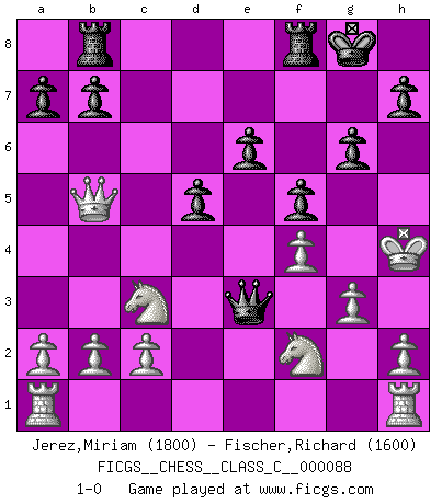 Last move : 1-0 2008 November 28 10:22:3 [Event "FICGS__CHESS__CLASS_C__000088"] [Site "FICGS"] [Date "2008.07.30"] [Round "1"] [White "Jerez,Miriam"] [Black "Fischer,Richard"] [Result "1-0"] [WhiteElo "1800"] [BlackElo "1600"] 1.d4 d5 2.Nc3 Nf6 3.Nf3 Bf5 4.Bf4 c5 5.Bxb8 Rxb8 6.dxc5 e6 7.e3 Bxc5 8.g3 O-O 9.Ne5 Qc7 10.f4 Bxe3 11.Qe2 Qb6 12.Qb5 Bf2+ 13.Kd1 Qd4+ 14.Nd3 Bg4+ 15.Be2 Bxe2+ 16.Kxe2 Ng4 17.Kf3 Qe3+ 18.Kxg4 f5+ 19.Kh4 g6 20.Nxf2 1-0 This chess game has been lost on time (started : 2008.07.30 19:48:12) Queen's pawn : Chigorin variation Kingside Castling by player Black (move 8) Player White won this chess game. Follow this game move after move (download)Avoid the crowd. Do your own thinking independently. Be the Chess player, not the Chess piece. (Ralph Charell) Eine Person mit durchschnittlichem IQ kann etwa eine ELO von 2000 erreichen. (Jonathan Levitt) Un sacrificio se refuta mucho mejor al aceptarlo. (Wilhelm Steinitz) Les écrivains ont utilisé les échecs pour analyser les côtés extrêmes de la nature humaine. Dans ce cadre, les échecs offrent un champ d'expérimentation idéal. Mais on pourrait faire la même chose avec la peinture. Et là, en vous référant à Van Gogh, vous ne tirerez pas de conclusion définitive sur les peintres. (Gary Kasparov) Chess is as much a mystery as women. (Purdy)