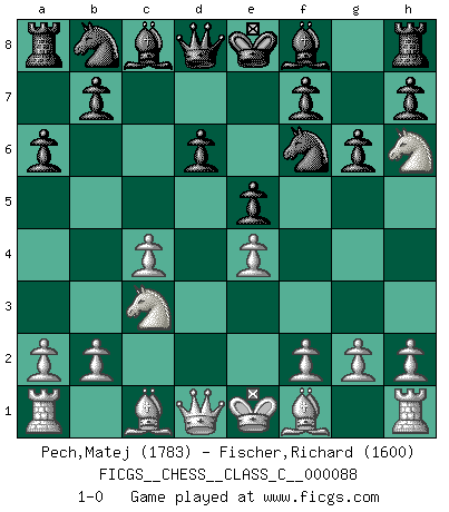 Last move : 1-0 2008 October 15 11:32:12 [Event "FICGS__CHESS__CLASS_C__000088"] [Site "FICGS"] [Date "2008.07.30"] [Round "1"] [White "Pech,Matej"] [Black "Fischer,Richard"] [Result "1-0"] [WhiteElo "1783"] [BlackElo "1600"] 1.e4 c5 2.Nf3 d6 3.d4 cxd4 4.Nxd4 a6 5.c4 Nf6 6.Nc3 e5 7.Nf5 g6 8.Nh6 1-0 This chess game has been lost on time (started : 2008.07.30 19:48:12) Sicilian Player White won this chess game. Follow this game move after move (download)The King is a fighting piece. Use it ! (Wilhelm Steinitz) Der Knackpunkt bei der Konzentration ist, daß wir nur durch sie etwas Neues und Ungewöhnliches am Schachbrett finden können. Sie ist der einzige Weg durch neue neue Ideen eine Überraschung zu bereiten. (Garry Kasparov) La estratégia requiere pensar, la táctica requiere observación. (Max Euwe) Seul un grand joueur sait à quel point il joue faiblement. (Xavier Tartacover) A belief is an idea the mind possesses, an idea that possesses the mind. (Robert Oxden Bolton)