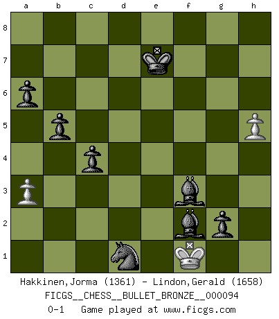 Last move : 0-1 2009 March 25 15:10:54 [Event "FICGS__CHESS__BULLET_BRONZE__000094"] [Site "FICGS"] [Date "2009.03.25"] [Round "1"] [White "Hakkinen,Jorma"] [Black "Lindon,Gerald"] [Result "0-1"] [WhiteElo "1361"] [BlackElo "1658"] 1.d4 Nf6 2.c4 d5 3.Nf3 dxc4 4.Nc3 e6 5.Bg5 c5 6.e3 h6 7.Bh4 Nc6 8.Bxc4 a6 9.O-O b5 10.Bd3 c4 11.Bb1 g5 12.Bg3 Nh5 13.Be5 f6 14.Bg3 Nxg3 15.fxg3 h5 16.h3 h4 17.gxh4 gxh4 18.d5 Nb4 19.Bg6+ Ke7 20.dxe6 Qb6 21.Nd4 Bh6 22.Qf3 Bb7 23.Qxf6+ Kd6 24.e7 Kc7 25.Qxb6+ Kxb6 26.a3 Nd3 27.Rf6+ Kc7 28.e4 Be3+ 29.Kh2 Bxd4 30.Rf7 Kd6 31.Raf1 Bc6 32.Ne2 Be5+ 33.Kh1 Be8 34.Rf8 Bxg6 35.Rxh8 Rxh8 36.Rf8 Kxe7 37.Rxh8 Bxh8 38.g3 Bxe4+ 39.Kh2 Be5 40.Nc3 hxg3+ 41.Kg1 Bf3 42.Nd1 Bd4+ 43.Nf2 Bxf2+ 44.Kf1 Nxb2 45.h4 Nd1 46.h5 g2+ 0-1 Queen's pawn game Kingside Castling by player White (move 9) Player Black won this chess game. Follow this game move after move (download)Chess is a cold bath for the mind. (Sir John Simon) Die größte Kunst beim Schach besteht darin dem Gegner nicht zu zeigen was er tun kann. (Garry Kasparov) No hay un Gran Maestro de Ajedrez que sea normal; solo se diferencían ellos por la magnitud de su locura. (Viktor Korchnoi) Il vaut toujours mieux jouer un plan faux de façon logique que de n'avoir pas de plan du tout. (Victor Kortchnoï) The absolute truth is the thing that makes people laugh. (Carl Reiner)