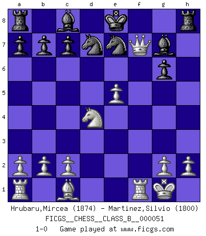 Last move : 1-0 2008 September 27 23:58:22 [Event "FICGS__CHESS__CLASS_B__000051"] [Site "FICGS"] [Date "2008.08.03"] [Round "1"] [White "Hrubaru,Mircea"] [Black "Martinez,Silvio"] [Result "1-0"] [WhiteElo "1874"] [BlackElo "1800"] 1.e4 e5 2.f4 d5 3.exd5 Qxd5 4.Nc3 Qd8 5.fxe5 Nd7 6.Nf3 Qe7 7.d4 g6 8.Bd3 f6 9.O-O fxe5 10.Nd5 Qd6 11.dxe5 Qxd5 12.Bxg6+ hxg6 13.Qxd5 Bg7 14.Nd4 Ne7 15.Qf7+ 1-0 KGD : Falkbeer counter-gambit Kingside Castling by player White (move 9) Player White won this chess game. Follow this game move after move (download)Chess is a more highly symbolic game, but the aggressions are therefore even more frankly represented in the play. It probably began as a war game; that is, the representation of a miniature battle between the forces of two kingdoms. (Karl Meninger) Vielleicht wirkt die Aura früherer Spieler glanzvoller als die der heutigen Spieler, aber das liegt daran, dass man kein Programm wie Fritz hatte, das einem all die Löcher in ihren Partien zeigt. (Vladimir Kramnik) Después de una mala apertura, hay una esperanza en el juego medio. Pero una vez que estas en finales, el momento de la verdad ha llegado. (Edmar Mednis) Vouloir jouer aux échecs contre soi-même est aussi paradoxal que vouloir marcher sur son ombre. (Stefan Zweig) The only difference between a tax man and a taxidermist is that the taxidermist leaves the skin. (Mark Twain)